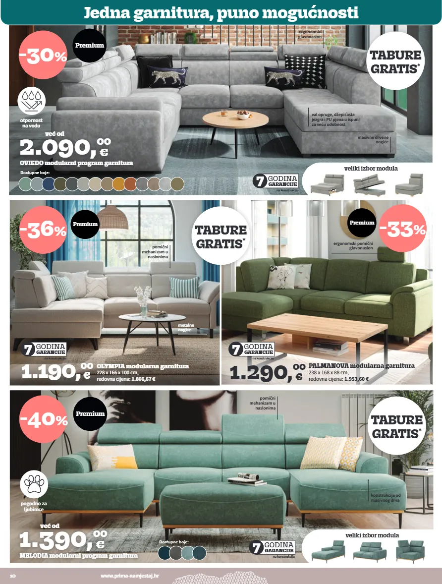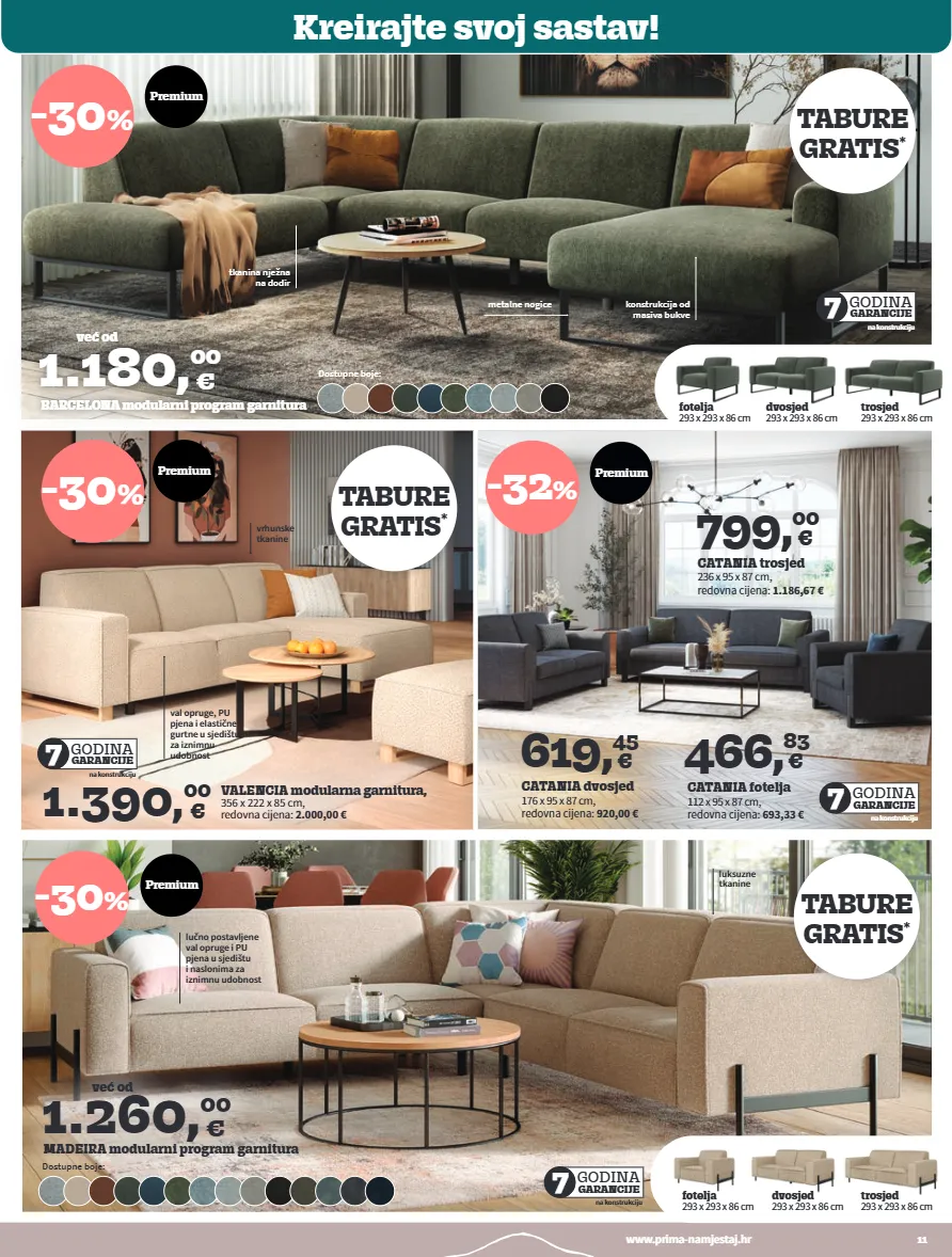 10 www.prima-namjestaj.hr - 30 % Premium masivne drvene nogice ergonomski glavonaslon OVIEDO modularni program garnitura 2.090, 00 € već od veliki izbor modula val opruge, džepićasta jezgra i PU pjena u ispuni za veću udobnost pomični mehanizam u naslonima Premium OLYMPIA modularna garnitura 228 x 166 x 100 cm, redovna cijena: 1.866,67 € 1.190, 00 € metalne nogice - 36 % ergonomski pomični glavonaslon 1.290 , 00 € PALMANOVA modularna garnitura 238 x 168 x 88 cm, redovna cijena: 1.953,60 € Premium MELODIA modularni program garnitura 1.390, 00 € već od veliki izbor modula pomični mehanizam u naslonima konstrukcija od masivnog drva - 40 % pogodno za ljubimce otpornost na vodu TABURE GRATIS * TABURE GRATIS * TABURE GRATIS * Premium - 33 % Dostupne boje: Dostupne boje: Jedna garnitura, puno mogućnosti na konstrukciju GARANCIJE GODINA 7 na konstrukciju GARANCIJE GODINA 7 na konstrukciju GARANCIJE GODINA 7 na konstrukciju GARANCIJE GODINA 7
