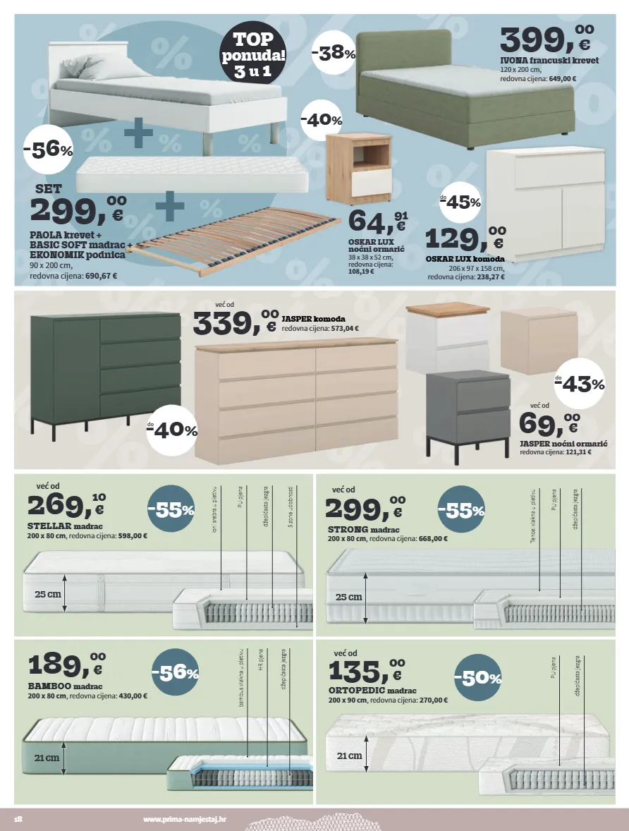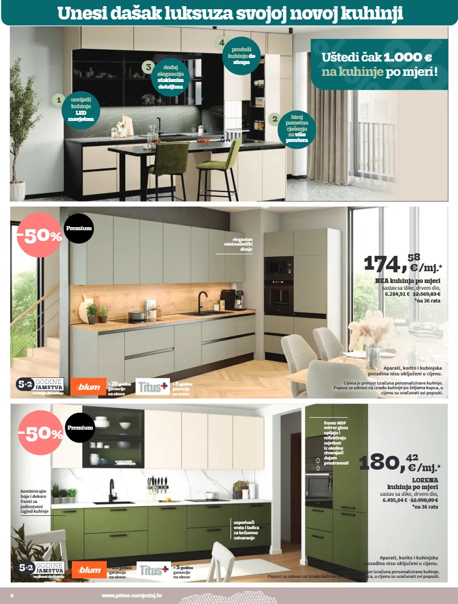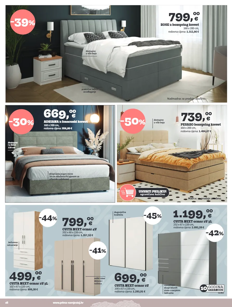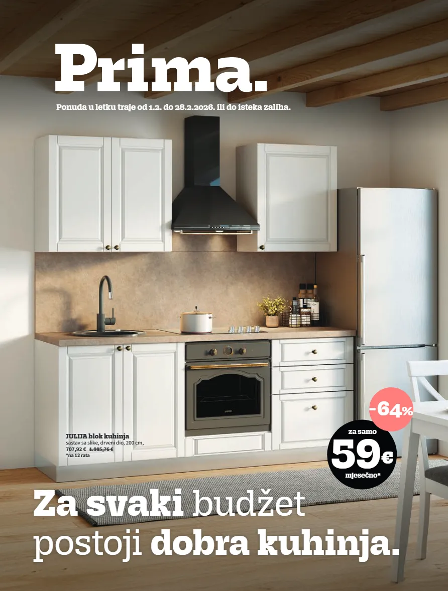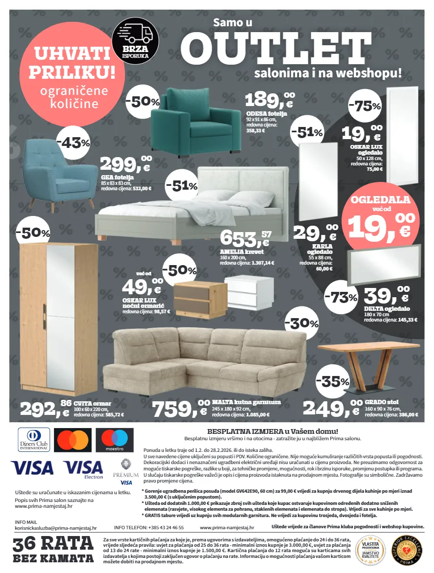 www.prima-namjestaj.hr 19 ponuda u letku traje od 1.2. do 28.2.2026. ili do isteka zaliha. u sve navedene cijene uključeni su popusti i pdv. količine ograničene. nije moguće kumuliranje različitih vrsta popusta ili pogodnosti. dekoracijski dodaci i nenaznačeni ugradbeni električni uređaji nisu uračunati u cijenu proizvoda. ne preuzimamo odgovornost za moguće tiskarske pogreške, razlike u boji, za tehničke promjene, mogućnosti, rok i brzinu isporuke, promjenu postupka ili programa. u slučaju tiskarske pogreške važeći je opis i cijena proizvoda istaknuta na prodajnom mjestu. fotografije su simbolične. zadržavamo pravo promjene cijena. besplatna izmjera u vašem domu! besplatnu izmjeru vršimo i na otocima - zatražite ju u najbližem prima salonu. info mail korisnickasluzba@prima-namjestaj.hr info telefon: +385 43 24 46 55 www.prima-namjestaj.hr uštede su uračunate u iskazanim cijenama u letku. popis svih prima salon saznajte na www.prima-namjestaj.hr uštede vrijede za članove prima kluba pogodnosti i webshop kupovine. za sve vrste kartičnih plaćanja za koje je, prema ugovorima s izdavateljima, omogućeno plaćanje do 24 i do 36 rata, vrijede sljedeća pravila: uvjet za plaćanja od 25 do 36 rata - minimalni iznos kupnje je 3.000,00 €, uvjet za plaćanja od 13 do 24 rate - minimalni iznos kupnje je 1.500,00 €. kartična plaćanja do 12 rata moguća su karticama svih izdavatelja s kojima postoji zaključen ugovor o plaćanju na rate. informaciju o mogućnosti plaćanja vašom karticom možete dobiti na prodajnom mjestu. 36 rata bez kamata jamstvo kvalitete vlastita proizvodnja * gorenje ugradbena perilica posuđa (model gv642e90, 60 cm) za 99,00 € vrijedi za kupnju drvenog dijela kuhinje po mjeri iznad 3.500,00 € (s uključenim popustom). * ušteda od dodatnih 1.000,00 € prikazuje zbroj svih ušteda koje kupac ostvaruje kupovinom određenih dodatno sniženih elemenata (rasvjete, visokog elementa za pohranu, staklenih elemenata i elemenata do stropa). vrijedi za sve kuhinje po mjeri. * gratis tabure vrijedi uz kupnju svih modularnih garnitura. ne vrijedi za kupovinu trosjeda, dvosjeda i fotelja. outlet salonima i na webshopu! samo u uhvati priliku! ograničene količine brza isporuka - 43 % - 51 % - 50 % odesa fotelja 92 x 91 x 86 cm, redovna cijena: 358,33 € 189, 00 € - 50 % - 50 % oskar lux noćni ormarić redovna cijena: 98,57 € već od 49, 00 € - 75 % oskar lux ogledalo 50 x 128 cm, redovna cijena: 75,00 € 19, 00 € ogledala 19, 00 već od € - 51 % karla ogledalo 55 x 88 cm, redovna cijena: 60,00 € 29, 00 € - 73 % - 30 % - 35 % delta ogledalo 180 x 70 cm redovna cijena: 145,33 € 39, 00 € amelia krevet 160 x 200 cm, redovna cijena: 1.307,14 € 653, 57 € cvita ormar 100 x 60 x 220 cm, redovna cijena: 585,72 € 292, 86 € gea fotelja 85 x 83 x 83 cm, redovna cijena: 532,00 € 299, 00 € grado stol 160 x 90 x 76 cm , redovna cijena: 386,00 € 249, 00 € malta kutna garnitura 245 x 180 x 92 cm , redovna cijena: 1.085,00 € 759, 00 €