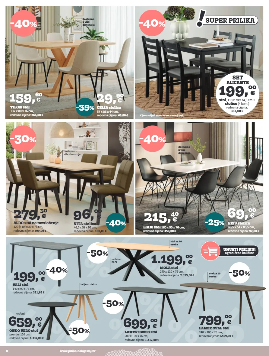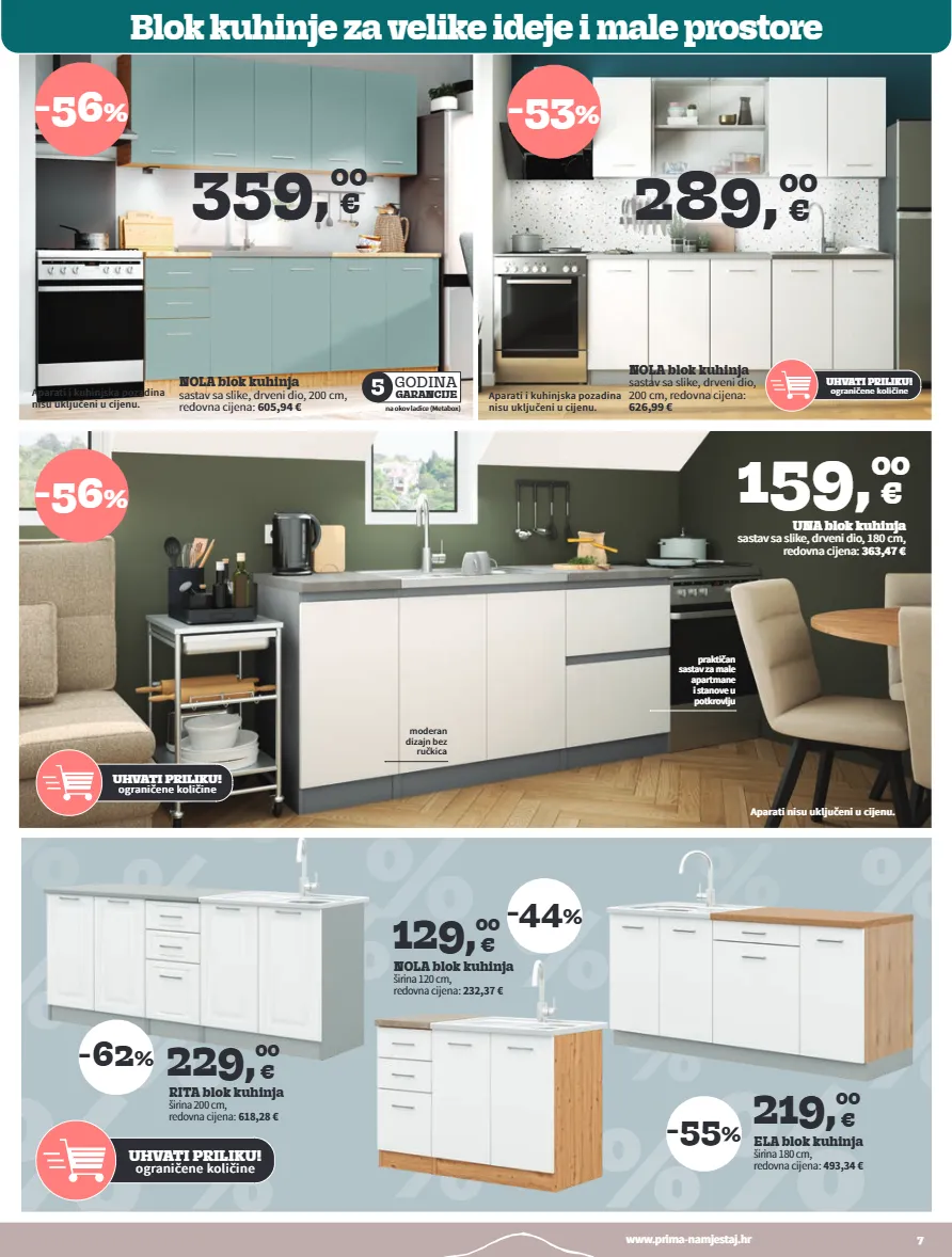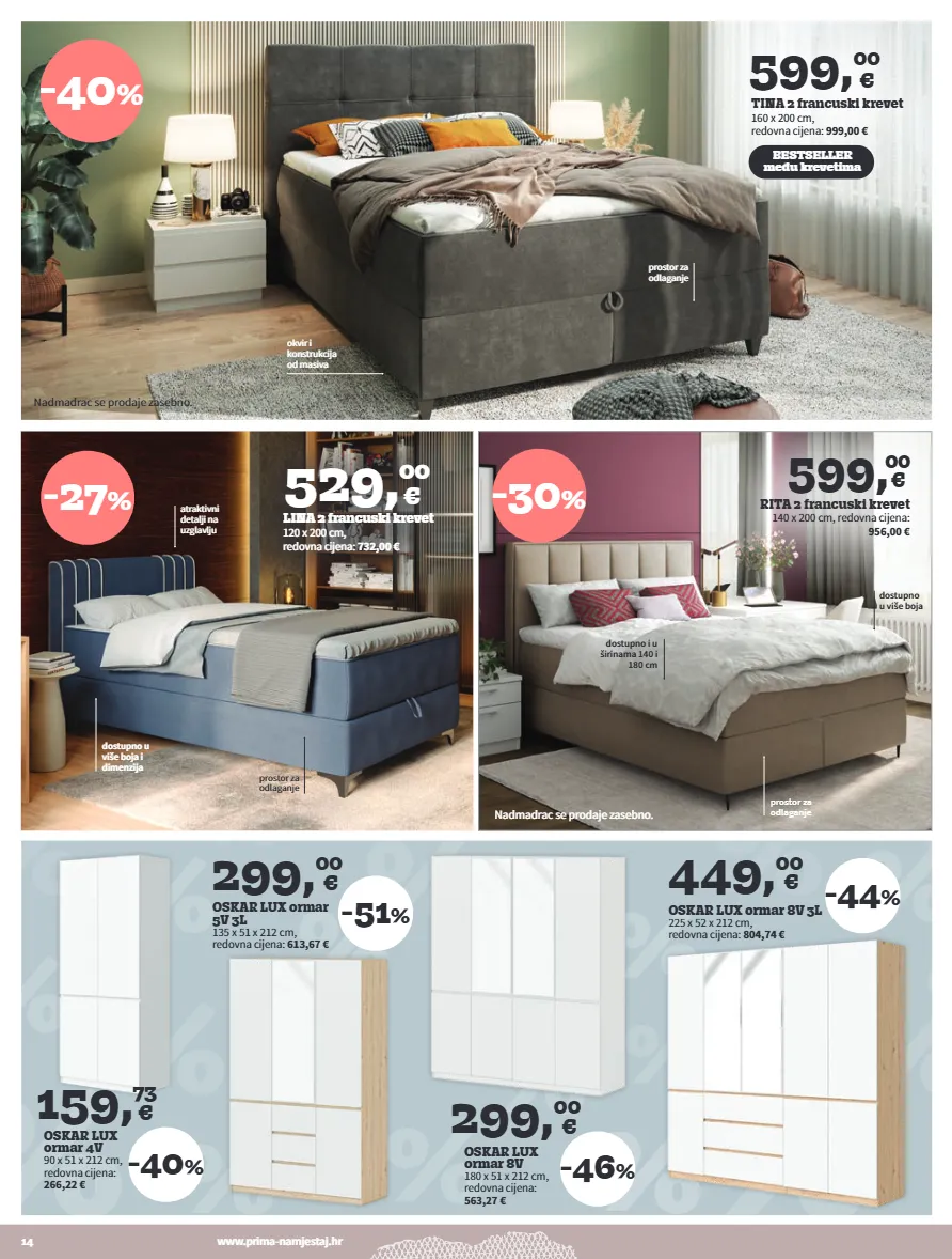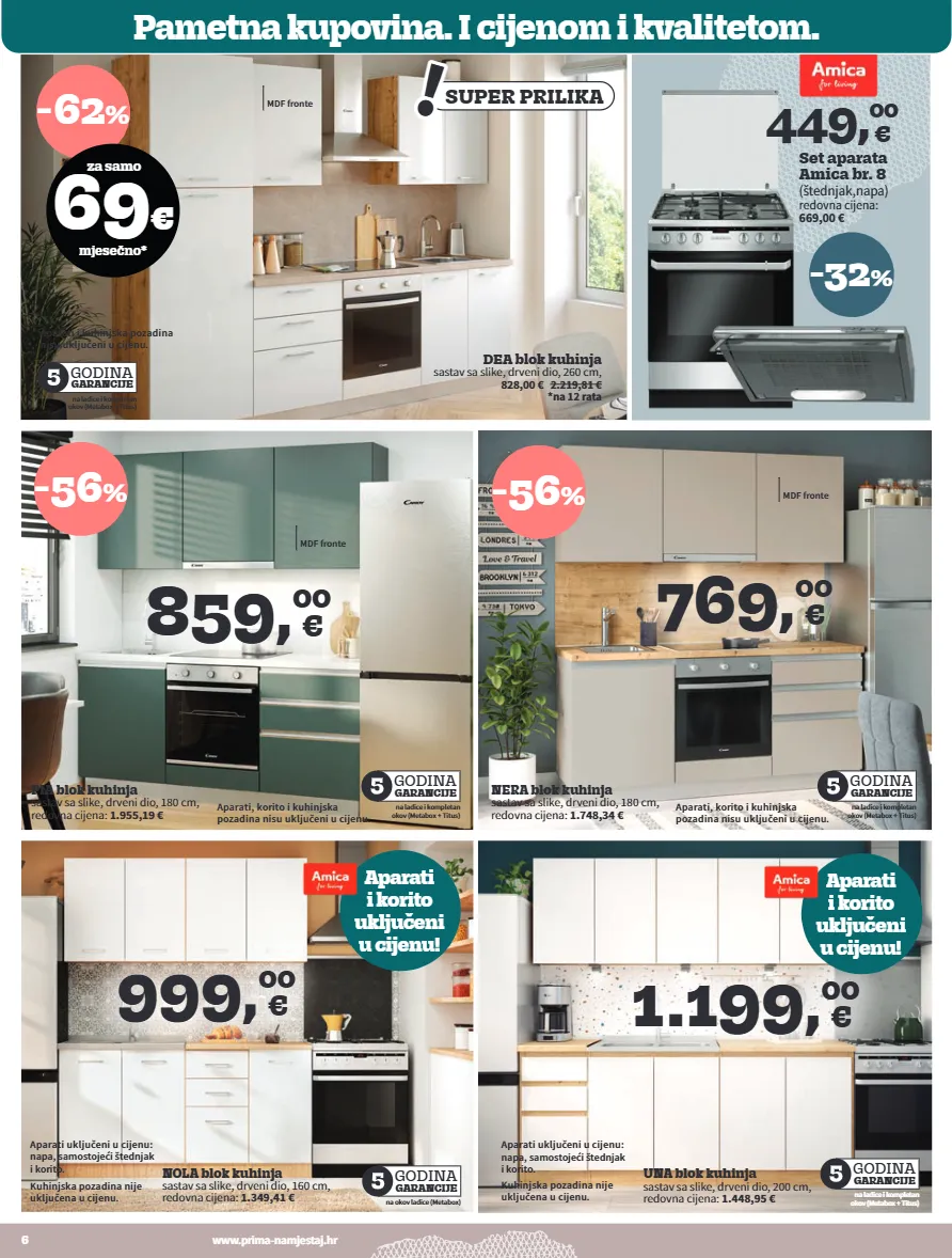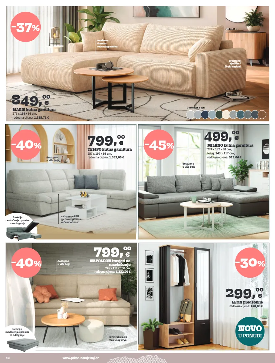 www.prima-namjestaj.hr 19 ponuda u letku traje od 1.2. do 28.2.2026. ili do isteka zaliha. u sve navedene cijene uključeni su popusti i pdv. količine ograničene. nije moguće kumuliranje različitih vrsta popusta ili pogodnosti. dekoracijski dodaci i nenaznačeni ugradbeni električni uređaji nisu uračunati u cijenu proizvoda. ne preuzimamo odgovornost za moguće tiskarske pogreške, razlike u boji, za tehničke promjene, mogućnosti, rok i brzinu isporuke, promjenu postupka ili programa. u slučaju tiskarske pogreške važeći je opis i cijena proizvoda istaknuta na prodajnom mjestu. fotografije su simbolične. zadržavamo pravo promjene cijena. besplatna izmjera u vašem domu! besplatnu izmjeru vršimo i na otocima - zatražite ju u najbližem prima salonu. info mail korisnickasluzba@prima-namjestaj.hr info telefon: +385 43 24 46 55 www.prima-namjestaj.hr uštede su uračunate u iskazanim cijenama u letku. popis svih prima salon saznajte na www.prima-namjestaj.hr uštede vrijede za članove prima kluba pogodnosti i webshop kupovine. za sve vrste kartičnih plaćanja za koje je, prema ugovorima s izdavateljima, omogućeno plaćanje do 24 i do 36 rata, vrijede sljedeća pravila: uvjet za plaćanja od 25 do 36 rata - minimalni iznos kupnje je 3.000,00 €, uvjet za plaćanja od 13 do 24 rate - minimalni iznos kupnje je 1.500,00 €. kartična plaćanja do 12 rata moguća su karticama svih izdavatelja s kojima postoji zaključen ugovor o plaćanju na rate. informaciju o mogućnosti plaćanja vašom karticom možete dobiti na prodajnom mjestu. 36 rata bez kamata jamstvo kvalitete vlastita proizvodnja * gorenje ugradbena perilica posuđa (model gv642e90, 60 cm) za 99,00 € vrijedi za kupnju drvenog dijela kuhinje po mjeri iznad 3.500,00 € (s uključenim popustom). * ušteda od dodatnih 1.000,00 € prikazuje zbroj svih ušteda koje kupac ostvaruje kupovinom određenih dodatno sniženih elemenata (rasvjete, visokog elementa za pohranu, staklenih elemenata i elemenata do stropa). vrijedi za sve kuhinje po mjeri. * gratis tabure vrijedi uz kupnju svih modularnih garnitura. ne vrijedi za kupovinu trosjeda, dvosjeda i fotelja. outlet salonima i na webshopu! samo u uhvati priliku! ograničene količine brza isporuka - 43 % - 51 % - 50 % odesa fotelja 92 x 91 x 86 cm, redovna cijena: 358,33 € 189, 00 € - 50 % - 50 % oskar lux noćni ormarić redovna cijena: 98,57 € već od 49, 00 € - 75 % oskar lux ogledalo 50 x 128 cm, redovna cijena: 75,00 € 19, 00 € ogledala 19, 00 već od € - 51 % karla ogledalo 55 x 88 cm, redovna cijena: 60,00 € 29, 00 € - 73 % - 30 % - 35 % delta ogledalo 180 x 70 cm redovna cijena: 145,33 € 39, 00 € amelia krevet 160 x 200 cm, redovna cijena: 1.307,14 € 653, 57 € cvita ormar 100 x 60 x 220 cm, redovna cijena: 585,72 € 292, 86 € gea fotelja 85 x 83 x 83 cm, redovna cijena: 532,00 € 299, 00 € grado stol 160 x 90 x 76 cm , redovna cijena: 386,00 € 249, 00 € malta kutna garnitura 245 x 180 x 92 cm , redovna cijena: 1.085,00 € 759, 00 €
