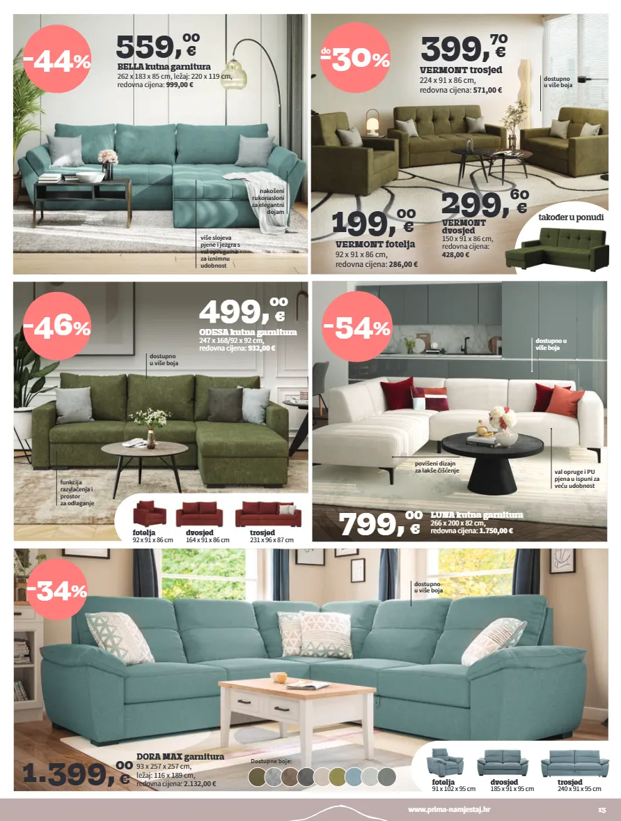 www.prima-namjestaj.hr 13 bella kutna garnitura 262 x 183 x 85 cm, ležaj: 220 x 119 cm, redovna cijena: 999,00 € 559 , 00 € više slojeva pjene i jezgra s val oprugama za iznimnu udobnost - 44 % nakošeni rukonasloni za elegantni dojam - 46 % odesa kutna garnitura 247 x 168/92 x 92 cm, redovna cijena: 932,00 € 499, 00 € funkcija razvlačenja i prostor za odlaganje dostupno u više boja vermont trosjed 224 x 91 x 86 cm, redovna cijena: 571,00 € 399 , 70 € vermont fotelja 92 x 91 x 86 cm, redovna cijena: 286,00 € 199 , 00 € dostupno u više boja - 30 % do - 54 % povišeni dizajn za lakše čišćenje val opruge i pu pjena u ispuni za veću udobnost dostupno u više boja luna kutna garnitura 266 x 200 x 82 cm, redovna cijena: 1.750,00 € 799, 00 € također u ponudi dostupno u više boja dora max garnitura 93 x 257 x 257 cm, ležaj: 116 x 189 cm, redovna cijena: 2.132,00 € 1.399, 00 € - 34 % fotelja 91 x 102 x 95 cm fotelja 92 x 91 x 86 cm dvosjed 185 x 91 x 95 cm dvosjed 164 x 91 x 86 cm trosjed 240 x 91 x 95 cm trosjed 231 x 96 x 87 cm dostupne boje: vermont dvosjed 150 x 91 x 86 cm, redovna cijena: 428,00 € 299 , 60 €