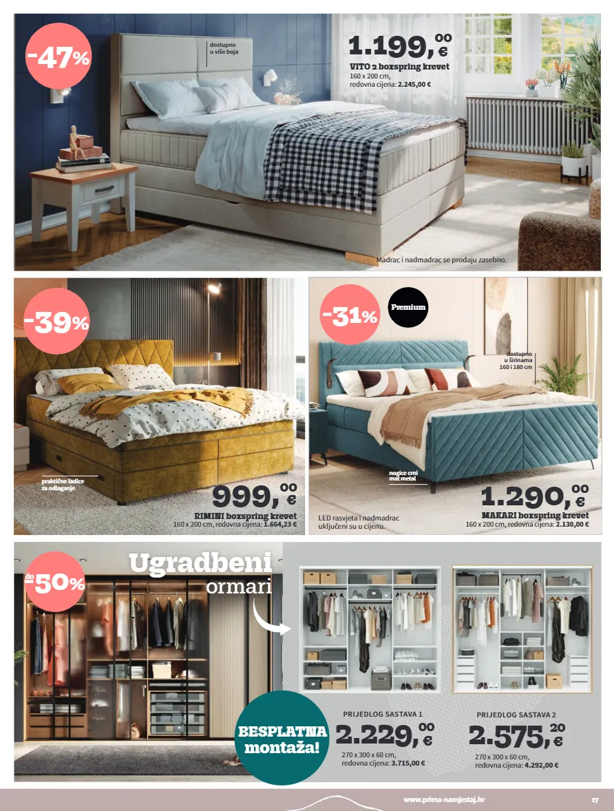 www.prima-namjestaj.hr 17 vito 2 boxspring krevet 160 x 200 cm, redovna cijena: 2.245,00 € 1.199 , 00 € dostupno u više boja prijedlog sastava 1 2.229 , 00 € 270 x 300 x 60 cm, redovna cijena: 3.715,00 € ugradbeni ormari prijedlog sastava 2 270 x 300 x 60 cm, redovna cijena: 4.292,00 € 2.575 , 20 € besplatna montaža! - 47 % madrac i nadmadrac se prodaju zasebno. - 50 % do praktične ladice za odlaganje rimini boxspring krevet 160 x 200 cm, redovna cijena: 1.664,23 € 999, 00 € - 39 % dostupno u širinama 160 i 180 cm premium - 31 % nogice crni mat metal led rasvjeta i nadmadrac uključeni su u cijenu. 1.290 , 00 € makari boxspring krevet 160 x 200 cm, redovna cijena: 2.130,00 €
