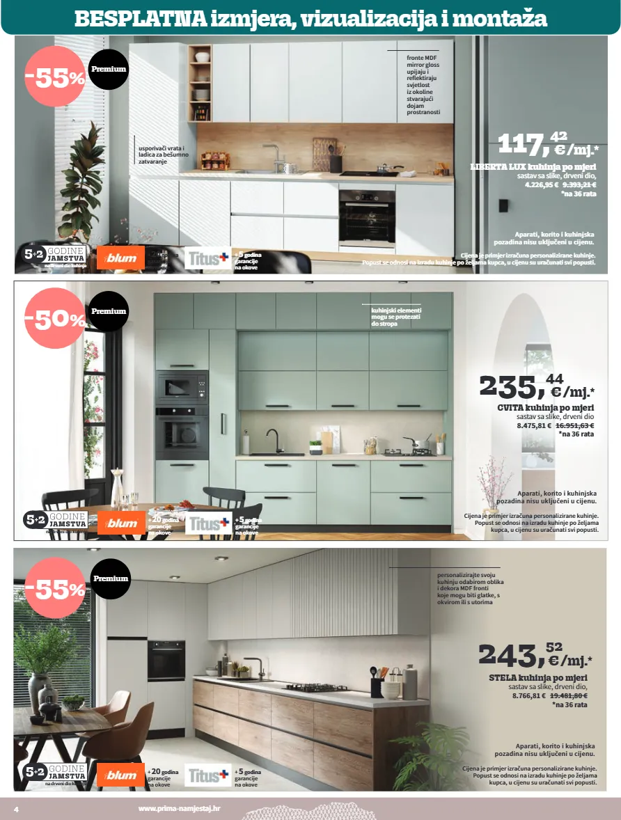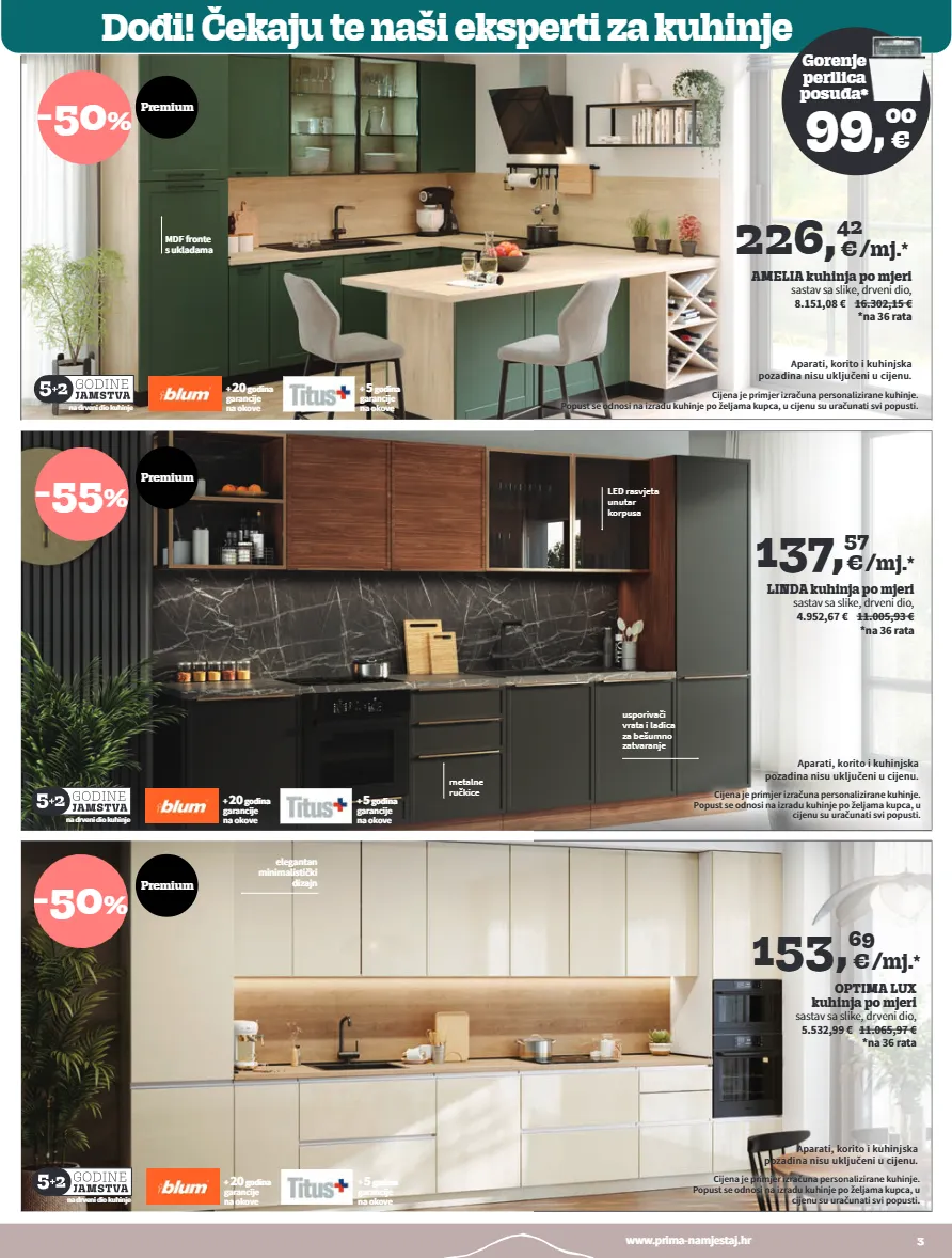www.prima-namjestaj.hr 3 nadmadrac se prodaje zasebno. mdf fronte s ukladama na drveni dio kuhinje + 20 godina garancije na okove + 5 godina garancije na okove aparati, korito i kuhinjska pozadina nisu uključeni u cijenu. cijena je primjer izračuna personalizirane kuhinje. popust se odnosi na izradu kuhinje po željama kupca, u cijenu su uračunati svi popusti. amelia kuhinja po mjeri sastav sa slike, drveni dio, 8.151,08 € 16.302,15 € *na 36 rata 226, 42 € / mj. * - 50 % premium elegantan minimalistički dizajn na drveni dio kuhinje + 20 godina garancije na okove + 5 godina garancije na okove aparati, korito i kuhinjska pozadina nisu uključeni u cijenu. optima lux kuhinja po mjeri sastav sa slike, drveni dio, 5.532,99 € 11.065,97 € *na 36 rata 153, 69 € / mj. * cijena je primjer izračuna personalizirane kuhinje. popust se odnosi na izradu kuhinje po željama kupca, u cijenu su uračunati svi popusti. - 50 % premium usporivači vrata i ladica za bešumno zatvaranje led rasvjeta unutar korpusa metalne ručkice premium - 55 % na drveni dio kuhinje + 20 godina garancije na okove + 5 godina garancije na okove linda kuhinja po mjeri sastav sa slike, drveni dio, 4.952,67 € 11.005,93 € *na 36 rata aparati, korito i kuhinjska pozadina nisu uključeni u cijenu. cijena je primjer izračuna personalizirane kuhinje. popust se odnosi na izradu kuhinje po željama kupca, u cijenu su uračunati svi popusti. 137, 57 € / mj. * dođi! čekaju te naši eksperti za kuhinje gorenje perilica posuđa * 99 , 00 €