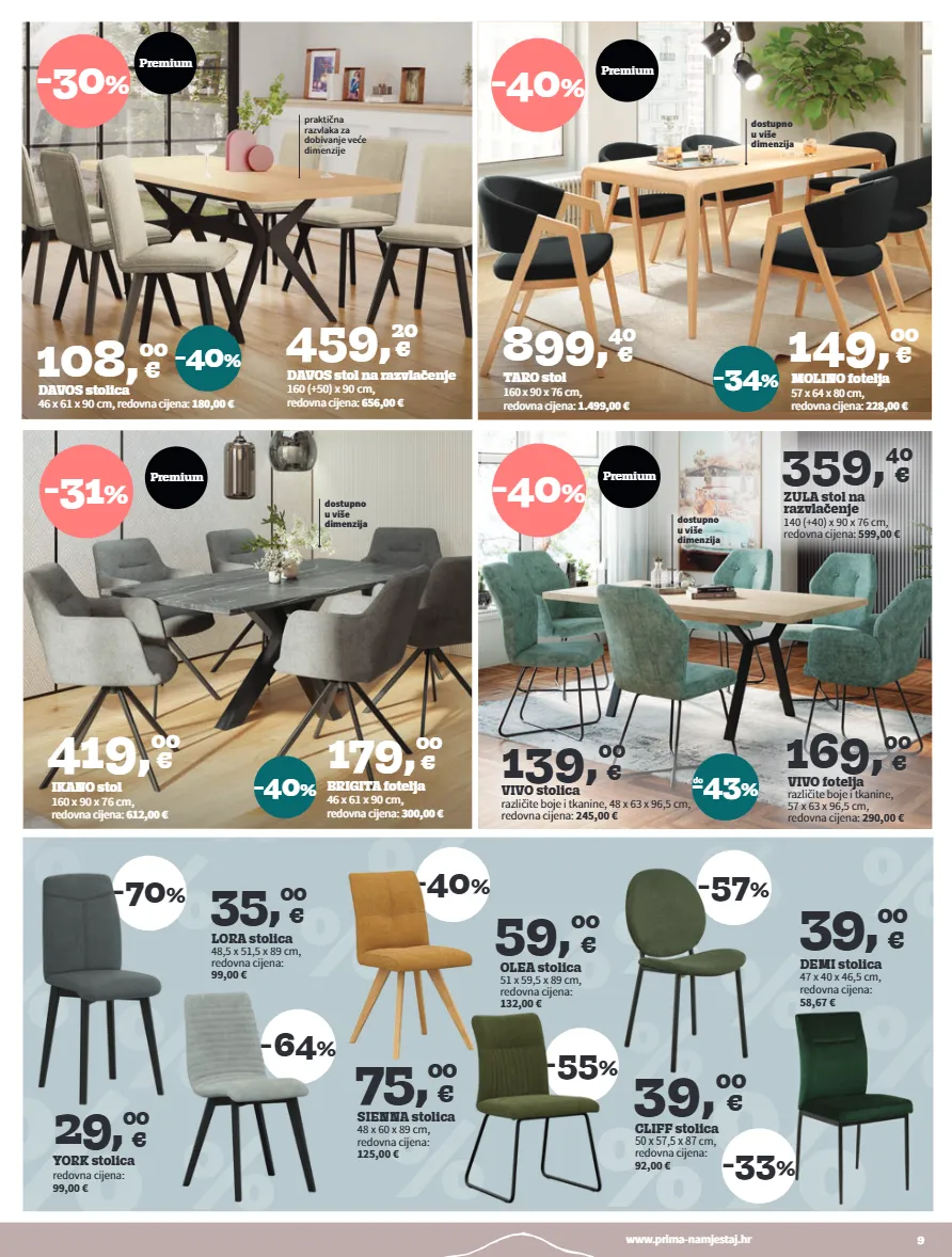 www.prima-namjestaj.hr 9 davos stolica 46 x 61 x 90 cm, redovna cijena: 180,00 € 108, 00 € - 30 % premium premium dostupno u više dimenzija molino fotelja 57 x 64 x 80 cm, redovna cijena: 228,00 € 149, 00 € taro stol 160 x 90 x 76 cm, redovna cijena: 1.499,00 € 899, 40 € - 40 % - 34 % - 40 % ikano stol 160 x 90 x 76 cm, redovna cijena: 612,00 € 419, 00 € dostupno u više dimenzija brigita fotelja 46 x 61 x 90 cm, redovna cijena: 300,00 € 179, 00 € premium - 31 % - 40 % vivo stolica različite boje i tkanine, 48 x 63 x 96,5 cm, redovna cijena: 245,00 € 139, 00 € vivo fotelja različite boje i tkanine, 57 x 63 x 96,5 cm, redovna cijena: 290,00 € 169, 00 € dostupno u više dimenzija zula stol na razvlačenje 140 (+40) x 90 x 76 cm, redovna cijena: 599,00 € 359, 40 € - 43 % do premium - 40 % - 70 % - 40 % - 57 % - 64 % lora stolica 48,5 x 51,5 x 89 cm, redovna cijena: 99,00 € 35, 00 € york stolica redovna cijena: 99,00 € 29, 00 € sienna stolica 48 x 60 x 89 cm, redovna cijena: 125,00 € 75, 00 € - 55 % olea stolica 51 x 59,5 x 89 cm, redovna cijena: 132,00 € 59, 00 € - 33 % demi stolica 47 x 40 x 46,5 cm, redovna cijena: 58,67 € 39, 00 € cliff stolica 50 x 57,5 x 87 cm , redovna cijena: 92,00 € 39, 00 € praktična razvlaka za dobivanje veće dimenzije davos stol na razvlačenje 160 (+50) x 90 cm, redovna cijena: 656,00 € 459, 20 €