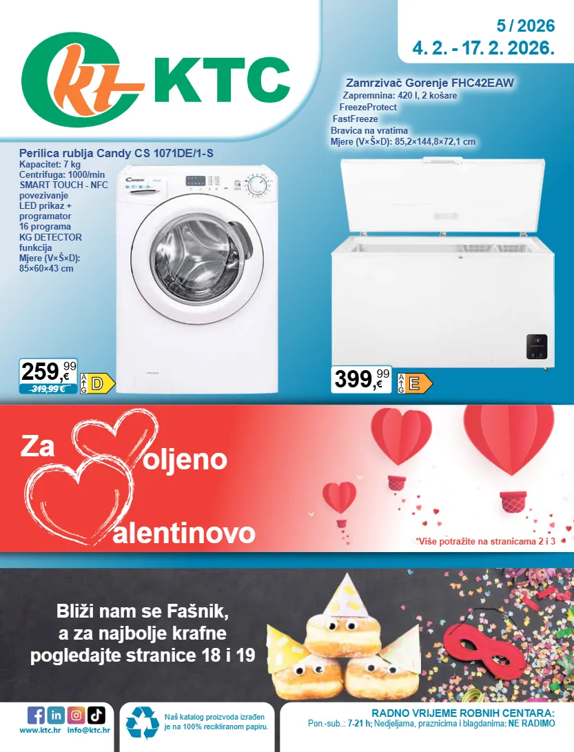 399 , 99 € 319,99 € 259 , 99 € 5 / 2026 4. 2. - 17. 2. 2026. naš katalog proizvoda izrađen je na 100% recikliranom papiru. www.ktc.hr info@ktc.hr radno vrijeme robnih centara: pon.-sub..: 7-21 h ; nedjeljama, praznicima i blagdanima : ne radimo bliži nam se fašnik, a za najbolje krafne pogledajte stranice 18 i 19 *više potražite na stranicama 2 i 3 za alentinovo oljeno zamrzivač gorenje fhc42eaw zapremnina: 420 l, 2 košare freezeprotect fastfreeze bravica na vratima mjere (vך×d): 85,2×144,8×72,1 cm perilica rublja candy cs 1071de/1-s kapacitet: 7 kg centrifuga: 1000/min smart touch - nfc povezivanje led prikaz + programator 16 programa kg detector funkcija mjere (vך×d): 85×60×43 cm