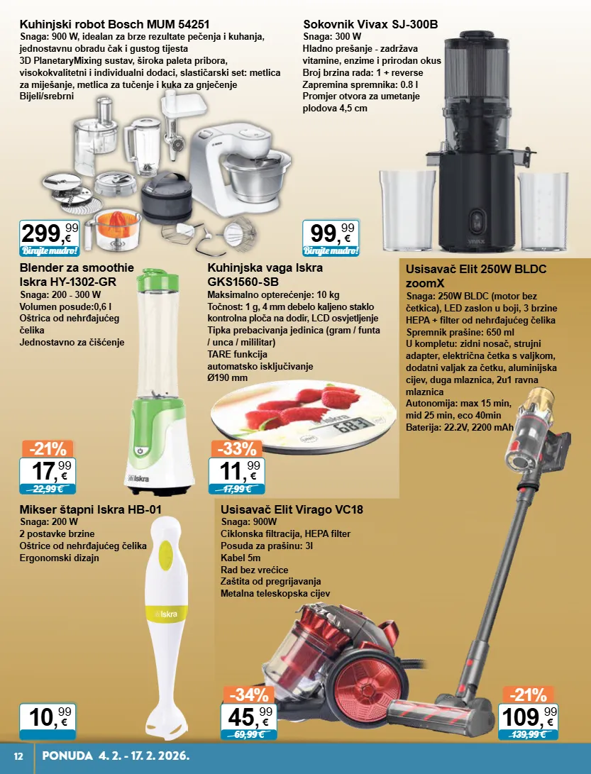 birajte mudro! 299 , 99 € 10 , 99 € -21% 22,99 € 17 , 99 € -33% 17,99 € 11 , 99 € 99 , 99 € birajte mudro! -21% 139,99 € 109 , 99 € -34% 69,99 € 45 , 99 € 12 ponuda 4. 2. - 17. 2. 2026. kuhinjski robot bosch mum 54251 snaga: 900 w, idealan za brze rezultate pečenja i kuhanja, jednostavnu obradu čak i gustog tijesta 3d planetarymixing sustav, široka paleta pribora, visokokvalitetni i individualni dodaci, slastičarski set: metlica za miješanje, metlica za tučenje i kuka za gnječenje bijeli/srebrni mikser štapni iskra hb-01 snaga: 200 w 2 postavke brzine oštrice od nehrđajućeg čelika ergonomski dizajn blender za smoothie iskra hy-1302-gr snaga: 200 - 300 w volumen posude:0,6 l oštrica od nehrđajućeg čelika jednostavno za čišćenje kuhinjska vaga iskra gks1560-sb maksimalno opterećenje: 10 kg točnost: 1 g, 4 mm debelo kaljeno staklo kontrolna ploča na dodir, lcd osvjetljenje tipka prebacivanja jedinica (gram / funta / unca / mililitar) tare funkcija automatsko isključivanje ø190 mm sokovnik vivax sj-300b snaga: 300 w hladno prešanje - zadržava vitamine, enzime i prirodan okus broj brzina rada: 1 + reverse zapremina spremnika: 0.8 l promjer otvora za umetanje plodova 4,5 cm usisavač elit 250w bldc zoomx snaga: 250w bldc (motor bez četkica), led zaslon u boji, 3 brzine hepa + filter od nehrđajućeg čelika spremnik prašine: 650 ml u kompletu: zidni nosač, strujni adapter, električna četka s valjkom, dodatni valjak za četku, aluminijska cijev, duga mlaznica, 2u1 ravna mlaznica autonomija: max 15 min, mid 25 min, eco 40min baterija: 22.2v, 2200 mah usisavač elit virago vc18 snaga: 900w ciklonska filtracija, hepa filter posuda za prašinu: 3l kabel 5m rad bez vrećice zaštita od pregrijavanja metalna teleskopska cijev