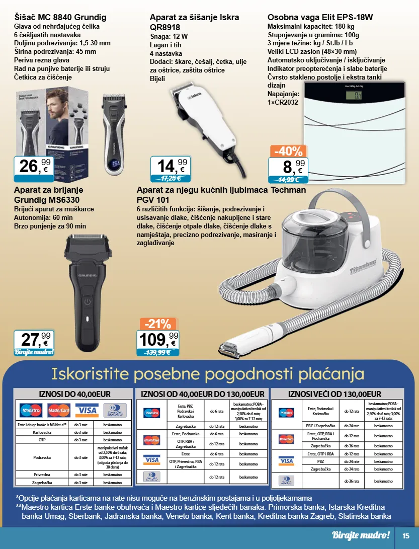 ** uz maestro kartice erste banke obuhvaća i maestro kartice sljedećih banaka: primors umag, sberbank, jadranska banka, veneto banka, kent banka, kreditna bank * opcije plaćanja karticama na rate nisu moguće na: benzinskim postajama ili u poljoljekarnama - za svu vrstu robe: mineralna gnojiva, sjemenski kukuruz i zaštita bilja erste i druge banke iz mb net-a** do 3 rate beskamatno karlovačka do 3 rate beskamatno otp do 3 rate beskamatno podravska do 3 rate manipulativni trošak od 2,50% do 6 rata; 3,00% za 7-12 rata; (odgoda plaćanja do 30 dana) privredna do 3 rate beskamatno zagrebačka do 3 rate beskamatno erste, pbz, podravska i karlovačka do 6 rata beskamatno; poba - manipulativni trošak od 2,50% do 6 rata; 3,00% za 7-12 rata; zagrebačka do 12 rata beskamatno erste, podravska do 6 rata beskamatno otp, rba i zagrebačka do 12 rata beskamatno erste do 6 rata beskamatno otp, privredna, rba i zagrebačka do 12 rata beskamatno do 12 rata beskamatno erste, podravska i karlovačka do 12 rata beskamatno; poba - manipulativni trošak od 2,50% do 6 rata; 3,00% za 7-12 rata; pbz i zagrebačka do 24 rate beskamatno erste, otp, rba i podravska do 12 rata beskamatno zagrebačka do 36 rata beskamatno erste, otp i rba do 12 rata beskamatno pbz do 24 rate beskamatno zagrebačka do 24 rate beskamatno do 36 rata beskamatno is po p iznosi do 40,00eur iznosi od 40,00eur do 130,00eur iznosi veći od 130,00eur ** uz maestro kartice erste banke obuhvaća i maestro kartice sljedećih banaka: primor umag, sberbank, jadranska banka, veneto banka, kent banka, kreditna bank * opcije plaćanja karticama na rate nisu moguće na: benzinskim postajama ili u poljoljekarnama - za svu vrstu robe: mineralna gnojiva, sjemenski kukuruz i zaštita bilja erste i druge banke iz mb net-a** do 3 rate beskamatno karlovačka do 3 rate beskamatno otp do 3 rate beskamatno podravska do 3 rate manipulativni trošak od 2,50% do 6 rata; 3,00% za 7-12 rata; (odgoda plaćanja do 30 dana) privredna do 3 rate beskamatno zagrebačka do 3 rate beskamatno erste, pbz, podravska i karlovačka do 6 rata beskamatno; poba - manipulativni trošak od 2,50% do 6 rata; 3,00% za 7-12 rata; zagrebačka do 12 rata beskamatno erste, podravska do 6 rata beskamatno otp, rba i zagrebačka do 12 rata beskamatno erste do 6 rata beskamatno otp, privredna, rba i zagrebačka do 12 rata beskamatno do 12 rata beskamatno erste, podravska i karlovačka do 12 rata beskamatno; poba - manipulativni trošak od 2,50% do 6 rata; 3,00% za 7-12 rata; pbz i zagrebačka do 24 rate beskamatno erste, otp, rba i podravska do 12 rata beskamatno zagrebačka do 36 rata beskamatno erste, otp i rba do 12 rata beskamatno pbz do 24 rate beskamatno zagrebačka do 24 rate beskamatno do 36 rata beskamatno is po p iznosi do 40,00eur iznosi od 40,00eur do 130,00eur iznosi veći od 130,00eur ** uz maestro kartice erste banke obuhvaća i maestro kartice sljedećih banaka: primors umag, sberbank, jadranska banka, veneto banka, kent banka, kreditna banka * opcije plaćanja karticama na rate nisu moguće na: benzinskim postajama ili u poljoljekarnama - za svu vrstu robe: mineralna gnojiva, sjemenski kukuruz i zaštita bilja erste i druge banke iz mb net-a** do 3 rate beskamatno karlovačka do 3 rate beskamatno otp do 3 rate beskamatno podravska do 3 rate manipulativni trošak od 2,50% do 6 rata; 3,00% za 7-12 rata; (odgoda plaćanja do 30 dana) privredna do 3 rate beskamatno zagrebačka do 3 rate beskamatno erste, pbz, podravska i karlovačka do 6 rata beskamatno; poba - manipulativni trošak od 2,50% do 6 rata; 3,00% za 7-12 rata; zagrebačka do 12 rata beskamatno erste, podravska do 6 rata beskamatno otp, rba i zagrebačka do 12 rata beskamatno erste do 6 rata beskamatno otp, privredna, rba i zagrebačka do 12 rata beskamatno do 12 rata beskamatno erste, podravska i karlovačka do 12 rata beskamatno; poba - manipulativni trošak od 2,50% do 6 rata; 3,00% za 7-12 rata; pbz i zagrebačka do 24 rate beskamatno erste, otp, rba i podravska do 12 rata beskamatno zagrebačka do 36 rata beskamatno erste, otp i rba do 12 rata beskamatno pbz do 24 rate beskamatno zagrebačka do 24 rate beskamatno do 36 rata beskamatno is po p iznosi do 40,00eur iznosi od 40,00eur do 130,00eur iznosi veći od 130,00eur *opcije plaćanja karticama na rate nisu moguće na benzinskim postajama i u poljoljekarnama **maestro kartica erste banke obuhvaća i maestro kartice sljedećih banaka: primorska banka, istarska kreditna banka umag, sberbank, jadranska banka, veneto banka, kent banka, kreditna banka zagreb, slatinska banka iskoristite posebne pogodnosti plaćanja -21% 139,99 € 109 , 99 € 27 , 99 € birajte mudro! 26 , 99 € -40% 14,99 € 8 , 99 € 14 , 99 € 17,25 € birajte mudro! 15 aparat za njegu kućnih ljubimaca techman pgv 101 6 različitih funkcija: šišanje, podrezivanje i usisavanje dlake, čišćenje nakupljene i stare dlake, čišćenje otpale dlake, čišćenje dlake s namještaja, precizno podrezivanje, masiranje i zaglađivanje aparat za brijanje grundig ms6330 brijaći aparat za muškarce autonomija: 60 min brzo punjenje za 90 min šišač mc 8840 grundig glava od nehrđajućeg čelika 6 češljastih nastavaka duljina podrezivanja: 1,5-30 mm širina podrezivanja: 45 mm periva rezna glava rad na punjive baterije ili struju četkica za čišćenje osobna vaga elit eps-18w maksimalni kapacitet: 180 kg stupnjevanje u gramima: 100g 3 mjere težine: kg / st.lb / lb veliki lcd zaslon (48×30 mm) automatsko uključivanje / isključivanje indikator preopterećenja i slabe baterije čvrsto stakleno postolje i ekstra tanki dizajn napajanje: 1×cr2032 aparat za šišanje iskra qr8918 snaga: 12 w lagan i tih 4 nastavka dodaci: škare, češalj, četka, ulje za oštrice, zaštita oštrice bijeli