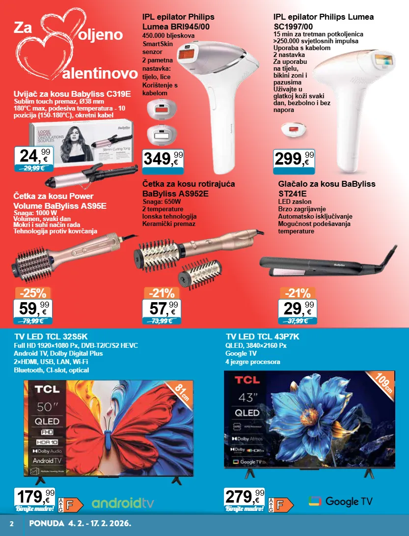 birajte mudro! 179 , 99 € birajte mudro! 279 , 99 € 349 , 99 € 299 , 99 € -21% 73,99 € 57 , 99 € -25% 79,99 € 59 , 99 € 24 , 99 € 29,99 € -21% 37,99 € 29 , 99 € 2 ponuda 4. 2. - 17. 2. 2026. 109 cm 81 cm tv led tcl 32s5k full hd 1920×1080 px, dvb-t2/c/s2 hevc android tv, dolby digital plus 2×hdmi, usb, lan, wi-fi bluetooth, ci-slot, optical tv led tcl 43p7k qled, 3840×2160 px google tv 4 jezgre procesora ipl epilator philips lumea bri945/00 450.000 bljeskova smartskin senzor 2 pametna nastavka: tijelo, lice korištenje s kabelom za alentinovo oljeno ipl epilator philips lumea sc1997/00 15 min za tretman potkoljenica >250.000 svjetlosnih impulsa uporaba s kabelom 2 nastavka za uporabu na tijelu, bikini zoni i pazusima uživajte u glatkoj koži svaki dan, bezbolno i bez napora četka za kosu rotirajuća babyliss as952e snaga: 650w 2 temperature ionska tehnologija keramički premaz četka za kosu power volume babyliss as95e snaga: 1000 w volumen, svaki dan mokri i suhi način rada tehnologija protiv kovrčanja uvijač za kosu babyliss c319e sublim touch premaz, ø38 mm 180°c max, podesiva temperatura - 10 pozicija (150-180°c), okretni kabel glačalo za kosu babyliss st241e led zaslon brzo zagrijavnje automatsko isključivanje mogućnost podešavanja temperature