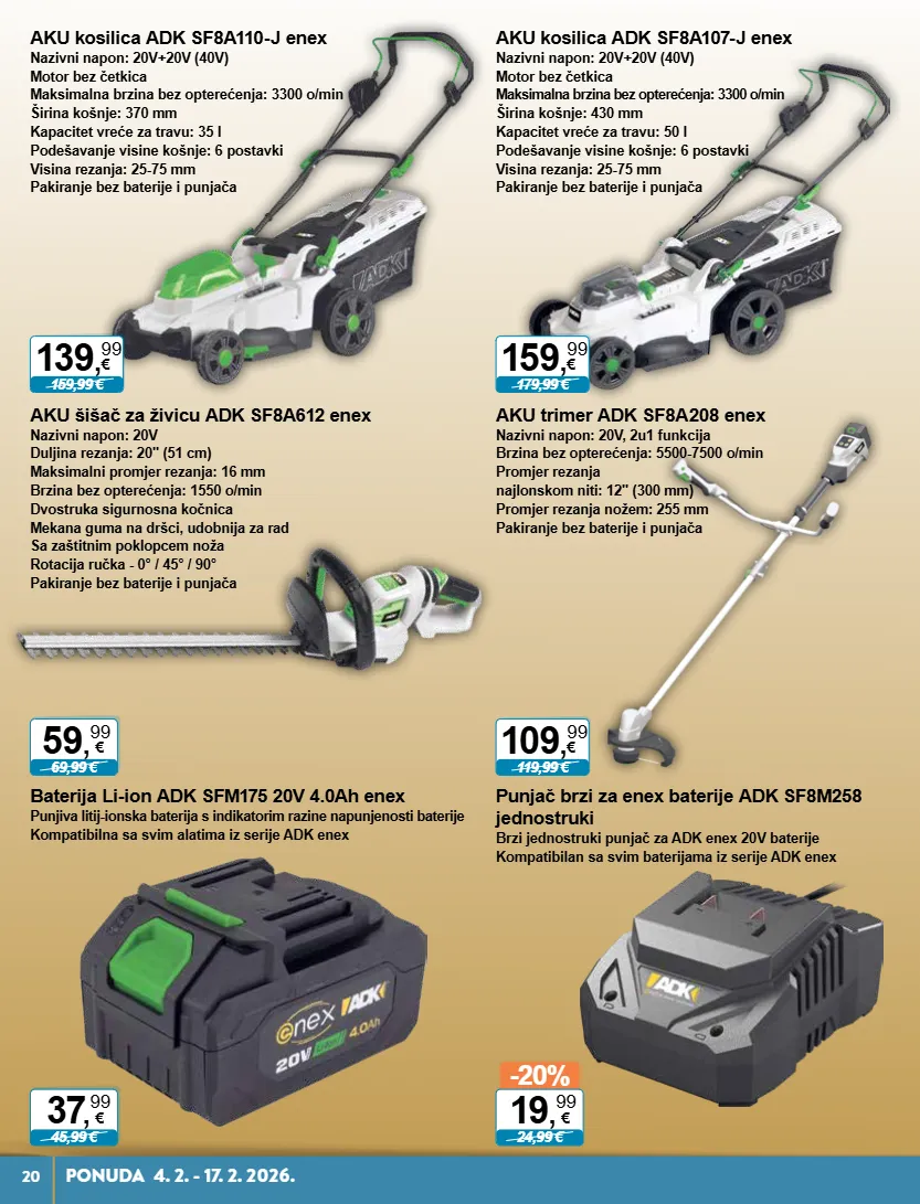 159,99 € 139 , 99 € 179,99 € 159 , 99 € 59 , 99 € 69,99 € 119,99 € 109 , 99 € 37 , 99 € 45,99 € -20% 24,99 € 19 , 99 € 20 ponuda4. 2. - 17.2. 2026. aku kosilica adk sf8a110-j enex nazivni napon: 20v+20v (40v) motor bez četkica maksimalna brzina bez opterećenja: 3300 o/min širina košnje: 370 mm kapacitet vreće za travu: 35 l podešavanje visine košnje: 6 postavki visina rezanja: 25-75 mm pakiranje bez baterije i punjača aku kosilica adk sf8a107-j enex nazivni napon: 20v+20v (40v) motor bez četkica maksimalna brzina bez opterećenja: 3300 o/min širina košnje: 430 mm kapacitet vreće za travu: 50 l podešavanje visine košnje: 6 postavki visina rezanja: 25-75 mm pakiranje bez baterije i punjača aku šišač za živicu adk sf8a612 enex nazivni napon: 20v duljina rezanja: 20'' (51 cm) maksimalni promjer rezanja: 16 mm brzina bez opterećenja: 1550 o/min dvostruka sigurnosna kočnica mekana guma na dršci, udobnija za rad sa zaštitnim poklopcem noža rotacija ručka - 0° / 45° / 90° pakiranje bez baterije i punjača aku trimer adk sf8a208 enex nazivni napon: 20v, 2u1 funkcija brzina bez opterećenja: 5500-7500 o/min promjer rezanja najlonskom niti: 12" (300 mm) promjer rezanja nožem: 255 mm pakiranje bez baterije i punjača baterija li-ion adk sfm175 20v 4.0ah enex punjiva litij-ionska baterija s indikatorim razine napunjenosti baterije kompatibilna sa svim alatima iz serije adk enex punjač brzi za enex baterije adk sf8m258 jednostruki brzi jednostruki punjač za adk enex 20v baterije kompatibilan sa svim baterijama iz serije adk enex