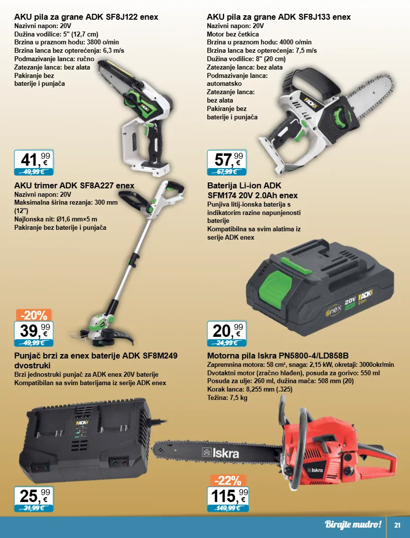 41 , 99 € 49,99 € 57 , 99 € 67,99 € -20% 49,99 € 39 , 99 € 20 , 99 € 24,99 € 25 , 99 € 31,99 € -22% 149,99 € 115 , 99 € birajte mudro! 21 aku pila za grane adk sf8j122 enex nazivni napon: 20v dužina vodilice: 5" (12,7 cm) brzina u praznom hodu: 3800 o/min brzina lanca bez opterećenja: 6,3 m/s podmazivanje lanca: ručno zatezanje lanca: bez alata pakiranje bez baterije i punjača aku pila za grane adk sf8j133 enex nazivni napon: 20v motor bez četkica brzina u praznom hodu: 4000 o/min brzina lanca bez opterećenja: 7,5 m/s dužina vodilice: 8" (20 cm) zatezanje lanca: bez alata podmazivanje lanca: automatsko zatezanje lanca: bez alata pakiranje bez baterije i punjača aku trimer adk sf8a227 enex nazivni napon: 20v maksimalna širina rezanja: 300 mm (12'') najlonska nit: ø1,6 mm×5 m pakiranje bez baterije i punjača baterija li-ion adk sfm174 20v 2.0ah enex punjiva litij-ionska baterija s indikatorim razine napunjenosti baterije kompatibilna sa svim alatima iz serije adk enex punjač brzi za enex baterije adk sf8m249 dvostruki brzi jednostruki punjač za adk enex 20v baterije kompatibilan sa svim baterijama iz serije adk enex motorna pila iskra pn5800-4/ld858b zapremnina motora: 58 cm 3 , snaga: 2,15 kw, okretaji: 3000okr/min dvotaktni motor (zračno hlađen), posuda za gorivo: 550 ml posuda za ulje: 260 ml, dužina mača: 508 mm (20) korak lanca: 8,255 mm (.325) težina: 7,5 kg