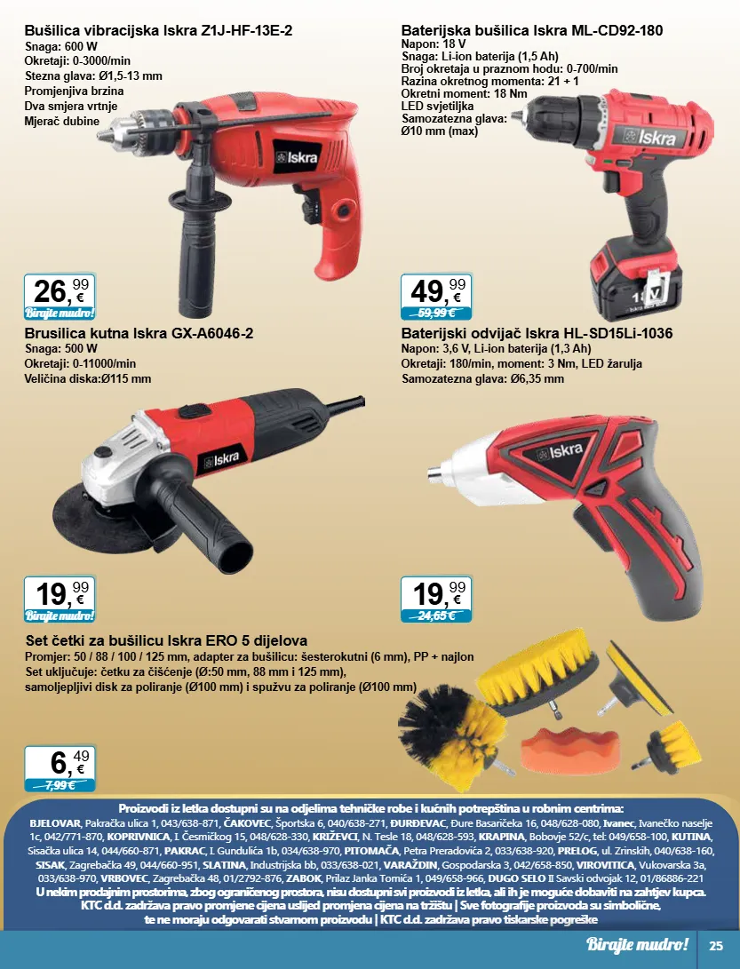 proizvodi iz letka dostupni su na odjelima tehničke robe i kućnih potrepština u robnim centrima: bjelovar , pakračka ulica 1, 043/638-871, čakovec , športska 6, 040/638-271, đurđevac , đure basaričeka 16, 048/628-080, ivanec , ivanečko naselje 1c, 042/771-870, koprivnica , i. česmičkog 15, 048/628-330, križevci , n. tesle 18, 048/628-593, krapina , bobovje 52/c, tel: 049/658-100, kutina , sisačka ulica 14, 044/660-871, pakrac , i. gundulića 1b, 034/638-970, pitomača , petra preradovića 2, 033/638-920, prelog , ul. zrinskih, 040/638-160, sisak , zagrebačka 49, 044/660-951, slatina , industrijska bb, 033/638-021, varaždin , gospodarska 3, 042/658-850, virovitica , vukovarska 3a, 033/638-970, vrbovec , zagrebačka 48, 01/2792-876, zabok , prilaz janka tomića 1, 049/658-966, dugo selo ii savski odvojak 12, 01/86886-221 u nekim prodajnim prostorima, zbog ograničenog prostora, nisu dostupni svi proizvodi iz letka, ali ih je moguće dobaviti na zahtjev kupca. ktc d.d. zadržava pravo promjene cijena uslijed promjena cijena na tržištu | sve fotografije proizvoda su simbolične, te ne moraju odgovarati stvarnom proizvodu | ktc d.d. zadržava pravo tiskarske pogreške 26 , 99 € birajte mudro! 19 , 99 € birajte mudro! 49 , 99 € 59,99 € 19 , 99 € 24,65 € 6 , 49 € 7,99 € birajte mudro! 25 bušilica vibracijska iskra z1j-hf-13e-2 snaga: 600 w okretaji: 0-3000/min stezna glava: ø1,5-13 mm promjenjiva brzina dva smjera vrtnje mjerač dubine brusilica kutna iskra gx-a6046-2 snaga: 500 w okretaji: 0-11000/min veličina diska:ø115 mm baterijska bušilica iskra ml-cd92-180 napon: 18 v snaga: li-ion baterija (1,5 ah) broj okretaja u praznom hodu: 0-700/min razina okretnog momenta: 21 + 1 okretni moment: 18 nm led svjetiljka samozatezna glava: ø10 mm (max) baterijski odvijač iskra hl-sd15li-1036 napon: 3,6 v, li-ion baterija (1,3 ah) okretaji: 180/min, moment: 3 nm, led žarulja samozatezna glava: ø6,35 mm set četki za bušilicu iskra ero 5 dijelova promjer: 50 / 88 / 100 / 125 mm, adapter za bušilicu: šesterokutni (6 mm), pp + najlon set uključuje: četku za čišćenje (ø:50 mm, 88 mm i 125 mm), samoljepljivi disk za poliranje (ø100 mm) i spužvu za poliranje (ø100 mm)