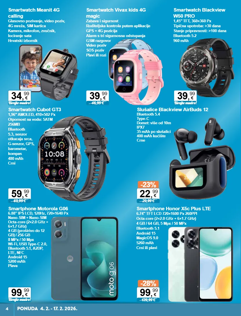 39 , 99 € 46,99 € 59 , 99 € 69,99 € 39 , 99 € birajte mudro! -23% 29,99 € 22 , 99 € 34 , 99 € birajte mudro! 99 , 99 € birajte mudro! - 28 % 139,99 € 99 , 99 € 4 ponuda 4. 2. - 17. 2. 2026. smartwatch vivax kids 4g magic zabava i sigurnost roditeljska kontrola putem aplikacije gps + 4g pozicija alarm s tri sigurnosna odstupanja gsm razgovor video poziv sos poziv plavi ili rozi smartwatch cubot gt3 1,96’’ amoled, 410×502 px otpornost na vodu: 5atm 256mb bluetooth 5.3, senzor otkucaja srca, g-senzor, gps, barometar, kompas 480 mah crni smartwatch blackview w50 pro 1,45’’ tft, 360×360 px tipična upotreba: >30 dana stanje pripravnosti: >100 dana bluetooth 5.2 960 mah slušalice blackview airbuds 12 bluetooth 5.4 type-c domet: više od 10m ipx7 35 mah po slušalici 400 mah kućište crne smartwatch meanit 4g calling glasovno pozivanje, video poziv, 4g mreža, sim kartica kamera, mikrofon, zvučnik, lociranje sata hrvatski izbornik smartphone motorola g06 6.88'' ips lcd, 120hz, 720×1640 px nano-sim + nano-sim octa-core (2×2.0 ghz + 6×1.7 ghz) 4 gb (proširivo do 12 gb) / 256 gb 8 mpx / 50 mpx wi-fi, usb type-c 2.0, bluetooth 5.1, a2dp, lte, nfc android 15 5200 mah plava smartphone honor x5c plus lte 6.74'' tft lcd 720×1600 px 260ppi octa-core (2×2.0 ghz + 6×1.7 ghz) 4 gb / 64 gb, 5 mpx / 50 mpx bluetooth 5.1 android 15 magicos 9.0 5260 mah crni ili plavi