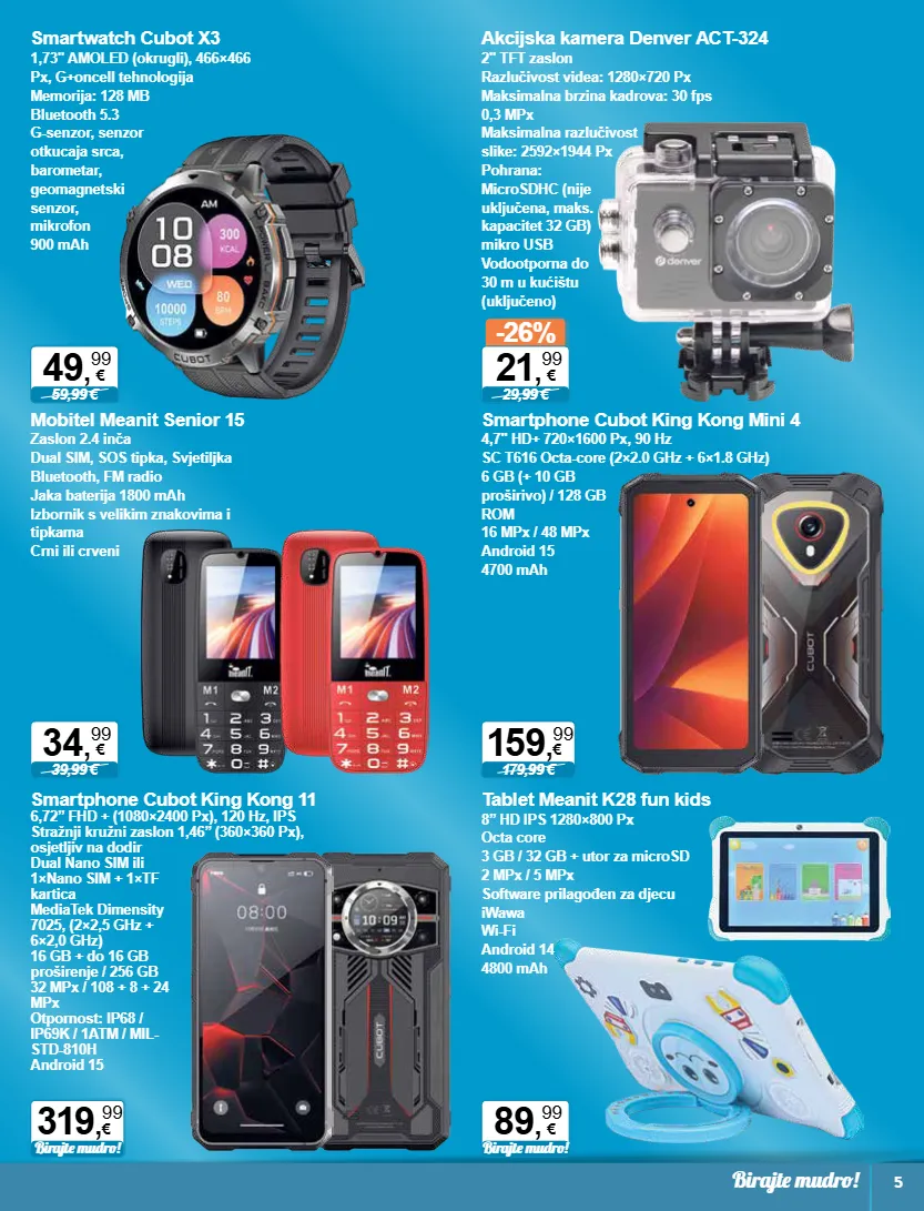 49 , 99 € 59,99 € birajte mudro! 319 , 99 € 179,99 € 159 , 99 € 34 , 99 € 39,99 € 89 , 99 € birajte mudro! -26% 29,99 € 21 , 99 € birajte mudro! 5 smartwatch cubot x3 1,73" amoled (okrugli), 466×466 px, g+oncell tehnologija memorija: 128 mb bluetooth 5.3 g-senzor, senzor otkucaja srca, barometar, geomagnetski senzor, mikrofon 900 mah smartphone cubot king kong 11 6,72’’ fhd + (1080×2400 px), 120 hz, ips stražnji kružni zaslon 1,46’’ (360×360 px), osjetljiv na dodir dual nano sim ili 1×nano sim + 1×tf kartica mediatek dimensity 7025, (2×2,5 ghz + 6×2,0 ghz) 16 gb + do 16 gb proširenje / 256 gb 32 mpx / 108 + 8 + 24 mpx otpornost: ip68 / ip69k / 1atm / mil- std-810h android 15 smartphone cubot king kong mini 4 4,7'' hd+ 720×1600 px, 90 hz sc t616 octa-core (2×2.0 ghz + 6×1.8 ghz) 6 gb (+ 10 gb proširivo) / 128 gb rom 16 mpx / 48 mpx android 15 4700 mah mobitel meanit senior 15 zaslon 2.4 inča dual sim, sos tipka, svjetiljka bluetooth, fm radio jaka baterija 1800 mah izbornik s velikim znakovima i tipkama crni ili crveni tablet meanit k28 fun kids 8’’ hd ips 1280×800 px octa core 3 gb / 32 gb + utor za microsd 2 mpx / 5 mpx software prilagođen za djecu iwawa wi-fi android 14 4800 mah akcijska kamera denver act-324 2'' tft zaslon razlučivost videa: 1280×720 px maksimalna brzina kadrova: 30 fps 0,3 mpx maksimalna razlučivost slike: 2592×1944 px pohrana: microsdhc (nije uključena, maks. kapacitet 32 gb) mikro usb vodootporna do 30 m u kućištu (uključeno)