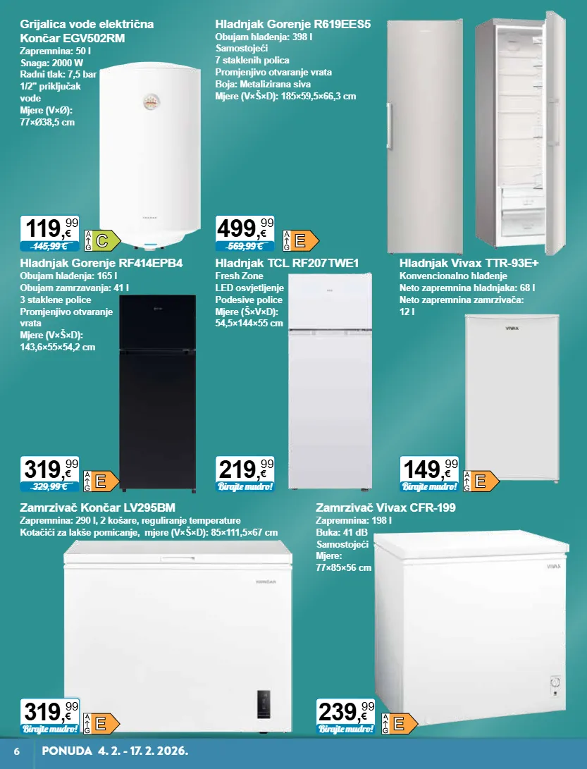 birajte mudro! 149 , 99 € birajte mudro! 239 , 99 € 569,99 € 499 , 99 € 329,99 € 319 , 99 € birajte mudro! 319 , 99 € birajte mudro! 219 , 99 € 145,99 € 119 , 99 € 6 ponuda 4. 2. - 17. 2. 2026. hladnjak vivax ttr-93e+ konvencionalno hlađenje neto zapremnina hladnjaka: 68 l neto zapremnina zamrzivača: 12 l zamrzivač vivax cfr-199 zapremnina: 198 l buka: 41 db samostojeći mjere: 77×85×56 cm hladnjak gorenje r619ees5 obujam hlađenja: 398 l samostojeći 7 staklenih polica promjenjivo otvaranje vrata boja: metalizirana siva mjere (vך×d): 185×59,5×66,3 cm hladnjak gorenje rf414epb4 obujam hlađenja: 165 l obujam zamrzavanja: 41 l 3 staklene police promjenjivo otvaranje vrata mjere (vך×d): 143,6×55×54,2 cm zamrzivač končar lv295bm zapremnina: 290 l, 2 košare, reguliranje temperature kotačići za lakše pomicanje, mjere (vך×d): 85×111,5×67 cm hladnjak tcl rf207twe1 fresh zone led osvjetljenje podesive police mjere (š×v×d): 54,5×144×55 cm grijalica vode električna končar egv502rm zapremnina: 50 l snaga: 2000 w radni tlak: 7,5 bar 1/2'' priključak vode mjere (v×ø): 77×ø38,5 cm