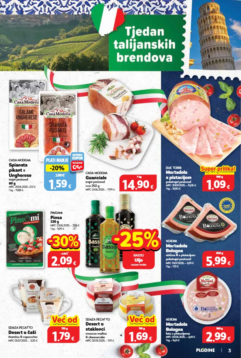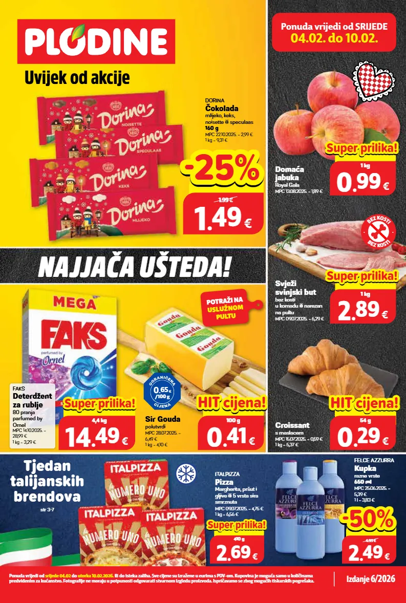 italpizza pizza margherita, pršut i gljive ili 5 vrsta sira smrznuta mpc 09.07.2025. = 4,75 € 1 kg = 6,56 € svježi svinjski but bez kosti u komadu ili narezan na pultu mpc 09.07.2025. = 6,29 € dorina čokolada mlijeko, keks, noisette ili speculaas 160 g mpc 22.10.2025. = 2,99 € 1 kg = 9,31 € top cijena! već od hit cijena! super prilika! 2 2 . . 49 49 € xxxxx samo u plodinama 4.99 € -50% -50% top cijena! već od hit cijena! super prilika! 1 1 . . 49 49 € xxxxx samo u plodinama 1.99 € -25% -25% felce azzurra kupka razne vrste 650 ml mpc 25.06.2025. = 5,39 € 1 l = 3,83 € 0.00 € 2 2 . . 89 89 € 1 kg super prilika! super prilika! 0.00 € 0 0 . . 99 99 € 1 kg super prilika! super prilika! 0.00 € 2 2 . . 69 69 € 410 g super prilika! super prilika! faks deterdžent za rublje 80 pranja parfumed by ornel mpc 14.10.2025. = 28,99 € 1 kg = 3,29 € domaća jabuka royal gala mpc 13.08.2025. = 1,89 € samo u plodinama -00% -00% 00.00 € top cijena! već od hit cijena! 14 14 . . 49 49 € 4,4 kg super prilika! super prilika! top cijena! već od hit cijena! 0 0 . . 29 29 € 54 g hit hit cijena! cijena! croissant s maslacem mpc 15.07.2025. = 0,59 € 1 kg = 5,37 € sir gouda polutvrdi mpc 28.07.2025. = 6,49 € 1 kg = 4,10 € 0.00 € 0 0 . . 41 41 € 100 g hit hit cijena! cijena! najjača ušteda! tjedan talijanskih brendova str 3-7 ponuda vrijedi od srijede 04.02. do 10.02. ponuda vrijedi od srijede 04.02 do utorka 10.02.2026. ili do isteka zaliha. sve cijene su izražene u eurima s pdv-om. kupovina je moguća samo u količinama predviđenim za kućanstvo. fotografije ne moraju u potpunosti odgovarati stvarnom izgledu proizvoda. ispričavamo se zbog mogućih tiskarskih pogrešaka. izdanje 6/2026 uvijek od akcije b e z k o s t i b e z k o s t i potraži na uslužnom pultu 0 . 65 € /100 g