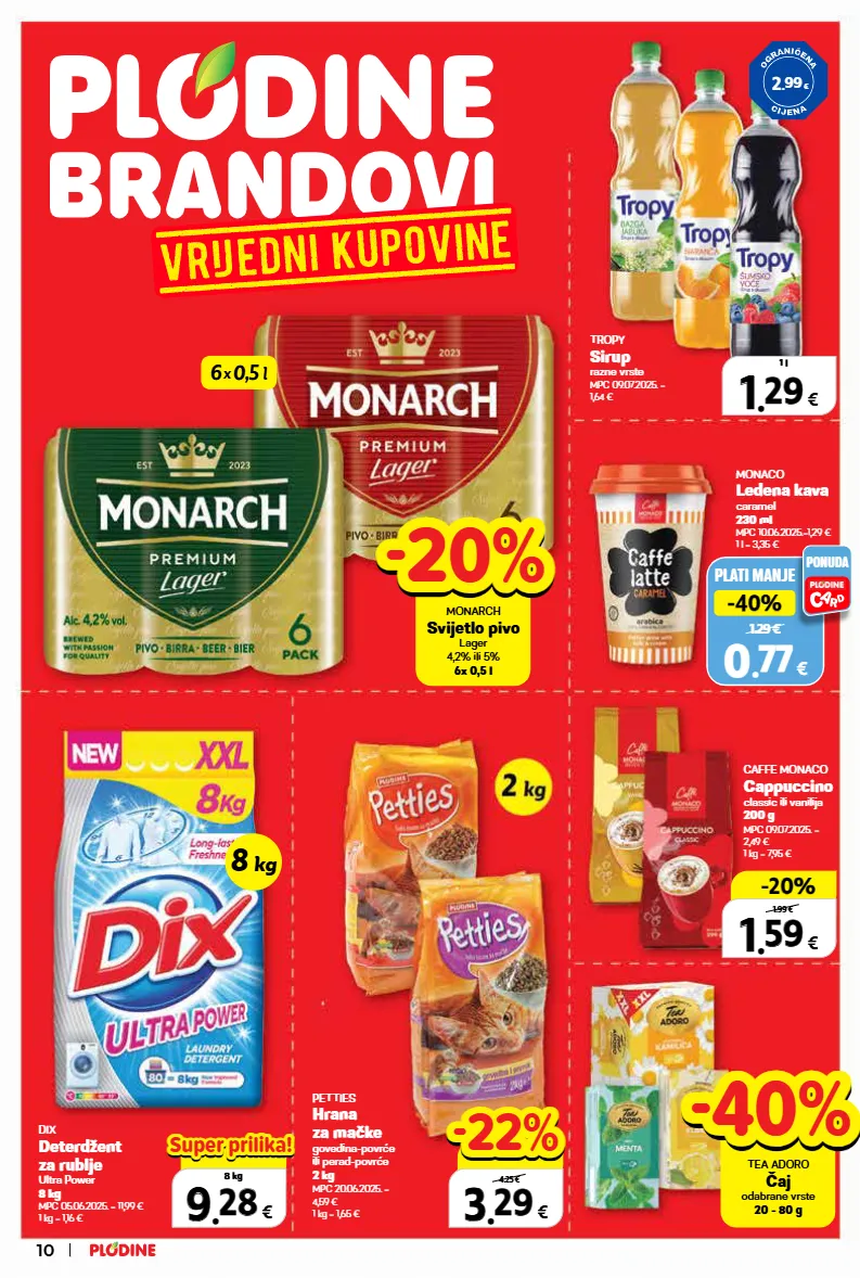 caffe monaco cappuccino classic ili vanilija 200 g mpc 09.07.2025. = 2,49 € 1 kg = 7,95 € 1 1 . . 59 59 € 200 g -20% -20% 1.99 € petties hrana za mačke govedina-povrće ili perad-povrće 2 kg mpc 20.06.2025. = 4,59 € 1 kg = 1,65 € 3 3 . . 29 29 € 2 kg 4.25 € -22% -22% -20% -20% monarch svijetlo pivo lager 4,2% ili 5% 6x 0,5 l -40% -40% tea adoro čaj odabrane vrste 20 - 80 g dix deterdžent za rublje ultra power 8 kg mpc 05.06.2025. = 11,99 € 1 kg = 1,16 € 0.00 € 9 9 . . 28 28 € 8 kg super prilika! super prilika! tropy sirup razne vrste mpc 09.07.2025. = 1,64 € 1 1 . . 29 29 € 1 l plati manje 1.29 € -40% -40% 0 0 . . 77 77 € ponuda monaco ledena kava caramel 230 ml mpc 10.06.2025.=1,29 € 1 l = 3,35 € 8 kg 2 . 99 € 6 x 0,5 l 10