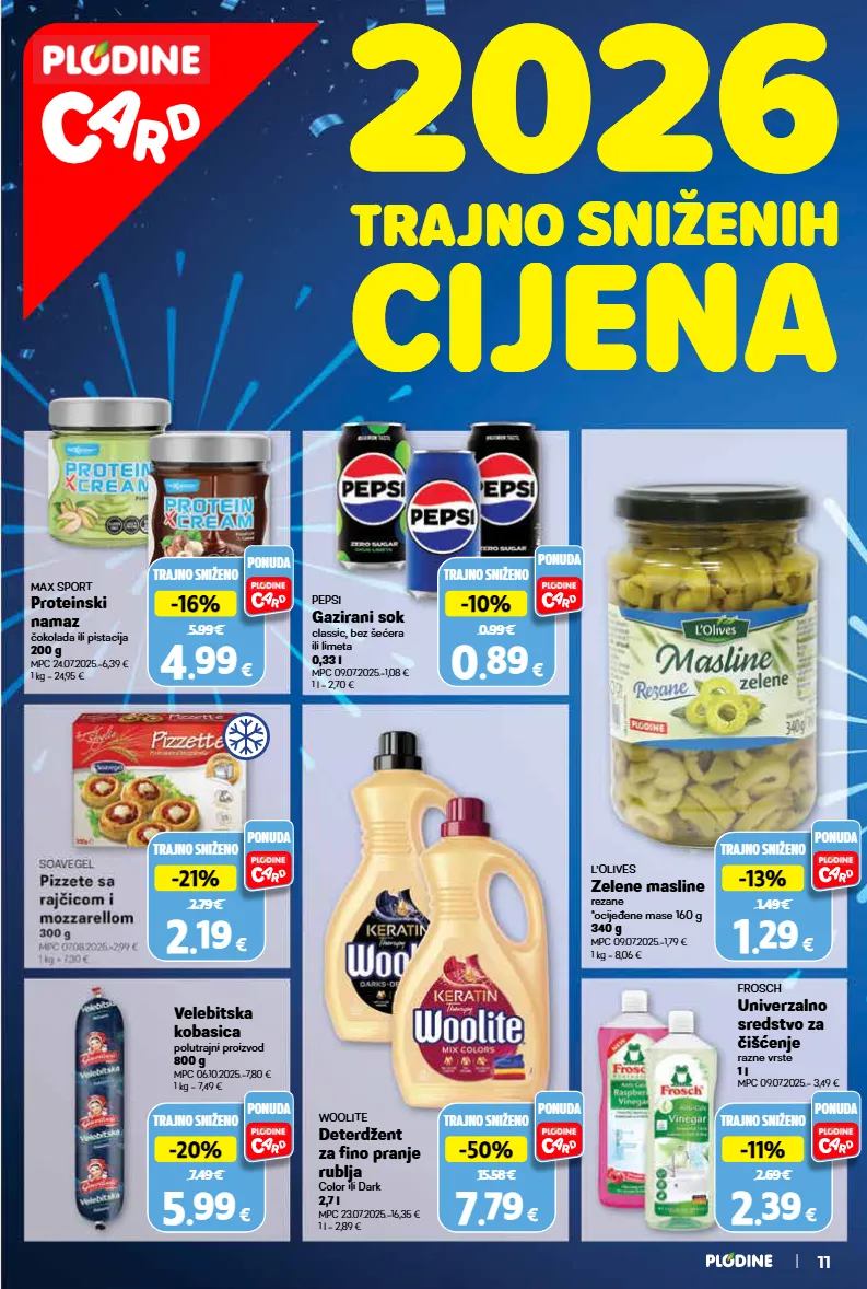 trajno sniženo 2.69 € -11% -11% 2 2 . . 39 39 € ponuda mpc 09.07.2025.= 3,49 € frosch univerzalno sredstvo za čišćenje razne vrste 1 l trajno sniženo 15.58 € -50% -50% 7 7 . . 79 79 € ponuda trajno sniženo 1.49 € -13% -13% 1 1 . . 29 29 € ponuda mpc 23.07.2025.=16,35 € 1 l = 2,89 € woolite deterdžent za fino pranje rublja color ili dark 2,7 l mpc 09.07.2025.=1,79 € 1 kg = 8,06 € l’olives zelene masline rezane *ocijeđene mase 160 g 340 g trajno sniženo 7.49 € -20% -20% 5 5 . . 99 99 € ponuda velebitska kobasica polutrajni proizvod 800 g mpc 06.10.2025.=7,80 € 1 kg = 7,49 € trajno sniženo 5.99 € -16% -16% 4 4 . . 99 99 € ponuda mpc 24.07.2025.=6,39 € 1 kg = 24,95 € max sport proteinski namaz čokolada ili pistacija 200 g trajno sniženo 0.99 € -10% -10% 0 0 . . 89 89 € ponuda mpc 09.07.2025.=1,08 € 1 l = 2,70 € pepsi gazirani sok classic, bez šećera ili limeta 0,33 l trajno sniženo 2.79 € -21% -21% 2 2 . . 19 19 € ponuda 11 trajno sniženih cijena trajno sniženih cijena