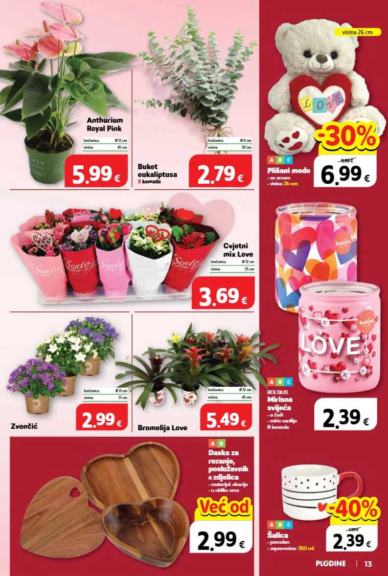 2 2 . . 39 39 € komad 3.99 € -40% -40% 6 6 . . 99 99 € komad 9.99 € -30% -30% 2 2 . . 79 79 € buket eukaliptusa 3 komada lončanica ø 0 cm visina 50 cm 3 3 . . 69 69 € cvjetni mix love lončanica ø 12 cm visina 25 cm 5 5 . . 49 49 € bromelija love lončanica ø 12 cm visina 45 cm 2 2 . . 99 99 € zvončić lončanica ø 11 cm visina 17 cm anthurium royal pink 5 5 . . 99 99 € lončanica ø 12 cm visina 45 cm 2 2 . . 39 39 € 3.99 € 2 2 . . 99 99 € već od već od 13 plišani medo • sa srcem • visina 26 cm a b c šalica • porculan • zapremnina: 250 ml a b c bolsius mirisna svijeća • u čaši • miris vanilije ili lavande a b c daska za rezanje, poslužavnik ili zdjelica • materijal: akacija • u obliku srca a b visina 26 cm
