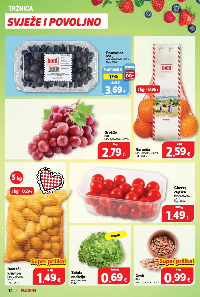 domaći krumpir mpc 09.07.2025. = 3,99 € 1 kg = 0,29 € grožđe rose mpc 28.05.2025. = 3,99 € naranča mpc 31.12.2025. = 3,49 € 1 kg = 0,86 € cherry rajčica mpc 02.05.2025. = 2,49 € 1 kg = 2,98 € grah pinto mpc 02.05.2025. = 1,99 € 0.00 € 1 1 . . 49 49 € 5 kg super prilika! super prilika! salata endivija mpc 17.09.2025. = 1,39 € plati manje 4.49 € -17% -17% 3 3 . . 69 69 € ponuda borovnica 500 g mpc 02.05.2025.=5,99 € 1 kg = 7,38 € 2 2 . . 79 79 € 1 kg 0 0 . . 69 69 € komad 2 2 . . 59 59 € 3 kg 1 1 . . 49 49 € 500 g 0.00 € 0 0 . . 99 99 € 1 kg super prilika! super prilika! svježe i povoljno tržnica komad 1 kg = 0,29 € 1 kg = 0,86 € 5 kg 14
