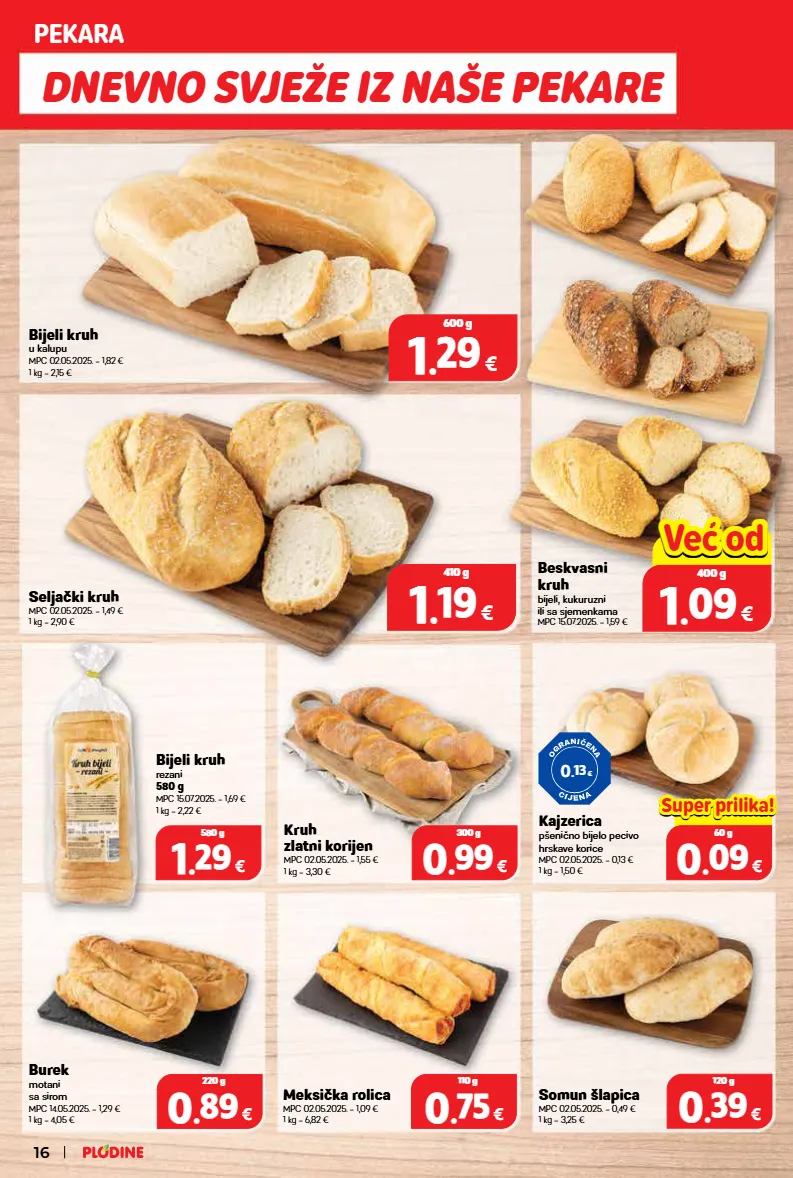 bijeli kruh u kalupu mpc 02.05.2025. = 1,82 € 1 kg = 2,15 € kajzerica pšenično bijelo pecivo hrskave korice mpc 02.05.2025. = 0,13 € 1 kg = 1,50 € burek motani sa sirom mpc 14.05.2025. = 1,29 € 1 kg = 4,05 € beskvasni kruh bijeli, kukuruzni ili sa sjemenkama mpc 15.07.2025. = 1,59 € seljački kruh mpc 02.05.2025. = 1,49 € 1 kg = 2,90 € 1 1 . . 19 19 € 410 g 0 0 . . 89 89 € 220 g 1 1 . . 29 29 € 600 g 0.00 € 1 1 . . 09 09 € 400 g već od već od somun šlapica mpc 02.05.2025. = 0,49 € 1 kg = 3,25 € 0 0 . . 39 39 € 120 g 0.00 € 0 0 . . 09 09 € 60 g super prilika! super prilika! 0 . 13 € meksička rolica mpc 02.05.2025. = 1,09 € 1 kg = 6,82 € kruh zlatni korijen mpc 02.05.2025. = 1,55 € 1 kg = 3,30 € 0 0 . . 99 99 € 300 g 0 0 . . 75 75 € 110 g bijeli kruh rezani 580 g mpc 15.07.2025. = 1,69 € 1 kg = 2,22 € 1 1 . . 29 29 € 580 g dnevno svježe iz naše pekare pekara 16