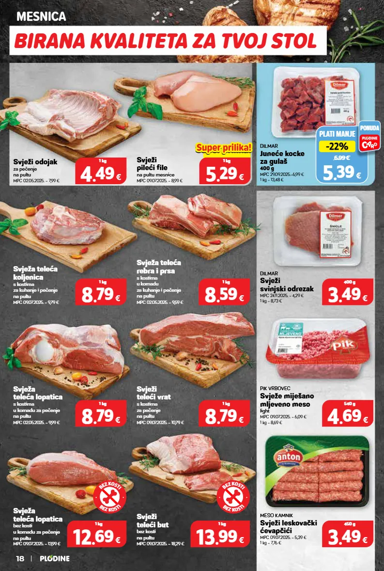 dilmar svježi svinjski odrezak mpc 24.11.2025. = 4,29 € 1 kg = 8,73 € pik vrbovec svježe miješano mljeveno meso light mpc 09.07.2025. = 6,09 € 1 kg = 8,69 € meso kamnik svježi leskovački ćevapčići mpc 09.07.2025. = 5,39 € 1 kg = 7,76 € svježi odojak za pečenje na pultu mpc 02.05.2025. = 7,99 € svježa teleća koljenica s kostima za kuhanje i pečenje na pultu mpc 09.07.2025. = 9,79 € svježa teleća lopatica s kostima u komadu za pečenje na pultu mpc 02.05.2025. = 9,99 € svježi pileći file na pultu mesnice mpc 09.07.2025. = 8,99 € svježi teleći vrat s kostima za pečenje na pultu mpc 09.07.2025. = 10,79 € svježi teleći but bez kosti na pultu mpc 09.07.2025. = 18,29 € svježa teleća rebra i prsa s kostima u komadu za kuhanje i pečenje na pultu mpc 02.05.2025. = 9,59 € svježa teleća lopatica bez kosti u komadu za pečenje na pultu mpc 09.07.2025. = 13,99 € plati manje 6.99 € -22% -22% 5 5 . . 39 39 € ponuda dilmar juneće kocke za gulaš 400 g mpc 29.09.2025.=6,99 € 1 kg = 13,48 € 8 8 . . 59 59 € 1 kg 8 8 . . 79 79 € 1 kg 3 3 . . 49 49 € 400 g 4 4 . . 69 69 € 540 g 8 8 . . 79 79 € 1 kg 3 3 . . 49 49 € 450 g 8 8 . . 79 79 € 1 kg 4 4 . . 49 49 € 1 kg 0.00 € 5 5 . . 29 29 € 1 kg super prilika! super prilika! 13 13 . . 99 99 € 1 kg 12 12 . . 69 69 € 1 kg birana kvaliteta za tvoj stol mesnica b e z k o s t i b e z k o s t i b e z k o s t i b e z k o s t i 18