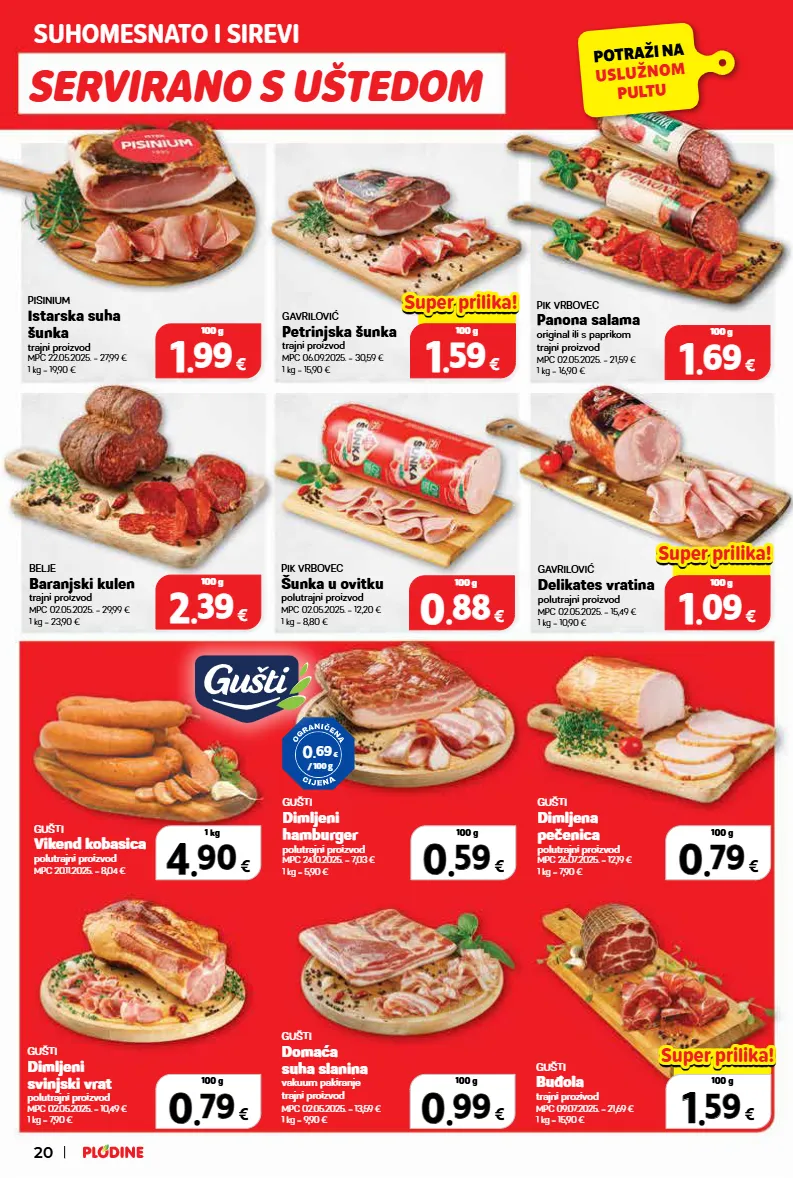 gušti buđola trajni prozivod mpc 09.07.2025. = 21,69 € 1 kg = 15,90 € gušti dimljeni hamburger polutrajni proizvod mpc 24.10.2025. = 7,03 € 1 kg = 5,90 € gušti dimljena pečenica polutrajni proizvod mpc 26.07.2025. = 12,19 € 1 kg = 7,90 € gušti dimljeni svinjski vrat polutrajni proizvod mpc 02.05.2025. = 10,49 € 1 kg = 7,90 € gušti domaća suha slanina vakuum pakiranje trajni proizvod mpc 02.05.2025. = 13,59 € 1 kg = 9,90 € pik vrbovec panona salama original ili s paprikom trajni proizvod mpc 02.05.2025. = 21,59 € 1 kg = 16,90 € gavrilović petrinjska šunka trajni proizvod mpc 06.09.2025. = 30,59 € 1 kg = 15,90 € pisinium istarska suha šunka trajni proizvod mpc 22.05.2025. = 27,99 € 1 kg = 19,90 € 1 1 . . 99 99 € 100 g 1 1 . . 69 69 € 100 g pik vrbovec šunka u ovitku polutrajni proizvod mpc 02.05.2025. = 12,20 € 1 kg = 8,80 € 0 0 . . 88 88 € 100 g belje baranjski kulen trajni proizvod mpc 02.05.2025. = 29,99 € 1 kg = 23,90 € 2 2 . . 39 39 € 100 g gavrilović delikates vratina polutrajni proizvod mpc 02.05.2025. = 15,49 € 1 kg = 10,90 € 0 0 . . 99 99 € 100 g 0 0 . . 79 79 € 100 g 0.00 € 1 1 . . 59 59 € 100 g super prilika! super prilika! 0.00 € 1 1 . . 09 09 € 100 g super prilika! super prilika! 0.00 € 1 1 . . 59 59 € 100 g super prilika! super prilika! 0 0 . . 59 59 € 100 g 4 4 . . 90 90 € 1 kg 0 0 . . 79 79 € 100 g 0 . 69 € / 100 g gušti vikend kobasica polutrajni proizvod mpc 20.11.2025. = 8,04 € servirano s uštedom suhomesnato i sirevi potraži na uslužnom pultu 20