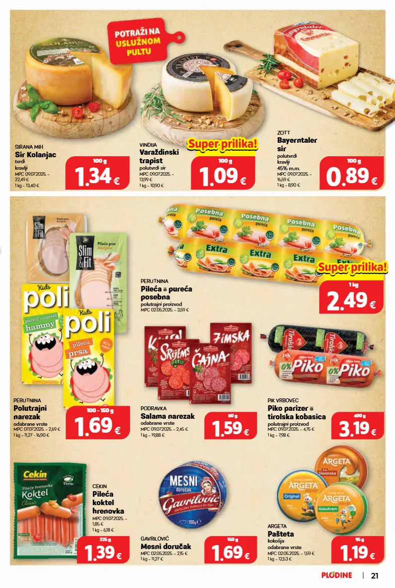 perutnina polutrajni narezak odabrane vrste mpc 07.07.2025. = 2,69 € 1 kg = 11,27 - 16,90 € argeta pašteta kokošja odabrane vrste mpc 02.05.2025. = 1,59 € 1 kg = 12,53 € sirana mih sir kolanjac tvrdi kravlji mpc 09.07.2025. = 22,49 € 1 kg = 13,40 € gavrilović mesni doručak mpc 02.05.2025. = 2,15 € 1 kg = 11,27 € podravka salama narezak odabrane vrste mpc 09.07.2025. = 2,45 € 1 kg = 19,88 € vindija varaždinski trapist polutvrdi sir mpc 09.07.2025. = 13,99 € 1 kg = 10,90 € pik vrbovec piko parizer ili tirolska kobasica polutrajni proizvod mpc 09.07.2025. = 4,75 € 1 kg = 7,98 € perutnina pileća ili pureća posebna polutrajni proizvod mpc 02.05.2025. = 3,59 € 3 3 . . 19 19 € 400 g 1 1 . . 59 59 € 80 g 1 1 . . 69 69 € 150 g 1 1 . . 34 34 € 100 g 1 1 . . 19 19 € 95 g 1 1 . . 69 69 € 100 - 150 g zott bayerntaler sir polutvrdi kravlji 45% m.m. mpc 09.07.2025. = 16,59 € 1 kg = 8,90 € 0 0 . . 89 89 € 100 g cekin pileća koktel hrenovka mpc 09.07.2025. = 1,85 € 1 kg = 6,18 € 1 1 . . 39 39 € 225 g 0.00 € 1 1 . . 09 09 € 100 g super prilika! super prilika! 0.00 € 2 2 . . 49 49 € 1 kg super prilika! super prilika! 21