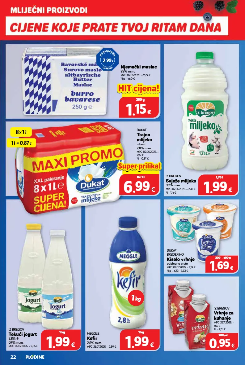 dukat brzo&fino kiselo vrhnje odabrane vrste mpc 09.07.2025. = 2,19 € 1 kg = 4,23 - 5,63 € 1 1 . . 69 69 € 300 - 400 g meggle kefir 2,8% m.m. mpc 26.07.2025. = 2,89 € ‘z bregov svježe mlijeko 3,2% m.m. mpc 02.05.2025. = 2,42 € 1 l = 1,14 € dukat trajno mlijeko u boci 2,8% m.m. mpc 02.05.2025. = 7,99 € 1 l = 0,87 € ‘z bregov tekući jogurt 2,8% ili 0,9% m.m. mpc 09.07.2025. = 2,65 € ‘z bregov vrhnje za kuhanje mpc 25.11.2025. = 1,59 € 1 l = 4,75 € 1 1 . . 99 99 € 1 kg 0 0 . . 95 95 € 200 ml 1 1 . . 99 99 € 1,75 l 1 1 . . 99 99 € 1 kg 0.00 € 6 6 . . 99 99 € 8x 1 l super prilika! super prilika! njemački maslac 82% m.m. mpc 02.05.2025. = 2,79 € 1 kg = 4,60 € 0.00 € 1 1 . . 15 15 € 250 g hit hit cijena! cijena! 2 . 99 € 1 kg 8 x 1 l 1 l = 0,87 € 22