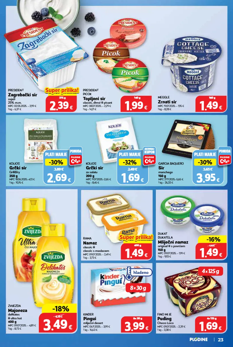 rama namaz classic ili classic s maslacem mpc 09.07.2025. = 2,49 € 1 kg = 3,73 € fino mi je puding choco loco mpc 09.07.2025. = 2,39 € 1 kg = 3,38 € zvijezda majoneza delikates ili ultra hot 400 g mpc 09.07.2025. = 4,89 € 1 kg = 8,73 € kinder pingui mliječni desert mpc 06.11.2025. = 3,99 € 1 kg = 16,63 € president picok topljeni sir classic, dimsi ili picant mpc 08.07.2025. = 2,29 € 1 kg = 14,21 € meggle zrnati sir mpc 19.07.2025. = 1,95 € 1 kg = 8,28 € president zagrebački sir svježi 25% m.m. mpc 02.05.2025. = 2,99 € 1 kg = 6,37 € dukat dukatela mliječni namaz original ili s povrćem 150 g mpc 09.07.2025. = 1,99 € 1 kg = 9,93 € 1 1 . . 49 49 € 150 g -16% -16% 1.79 € 1 1 . . 49 49 € 180 g 1 1 . . 99 99 € 140 g 3 3 . . 99 99 € 8x 30 g 3 3 . . 49 49 € 400 g -18% -18% 4.29 € 1 1 . . 69 69 € 4x 125 g 0.00 € 1 1 . . 49 49 € 400 g super prilika! super prilika! 0.00 € 2 2 . . 39 39 € 375 g super prilika! super prilika! plati manje 5.65 € -30% -30% 3 3 . . 95 95 € ponuda garcia baquero sir manchego 150 g mpc 27.11.2025.=5,65 € 1 kg = 26,33 € plati manje 2.49 € -32% -32% 1 1 . . 69 69 € aktiviraj kupon kolios grčki sir za salatu 200 g mpc 11.07.2025.=2,65 € 1 kg = 8,45 € plati manje 3.89 € -30% -30% 2 2 . . 69 69 € ponuda kolios grčki sir grill&fry 250 g mpc 18.06.2025.=4,13 € 1 kg = 10,76 € 8 x 30 g 4 x 125 g hlađeno 23