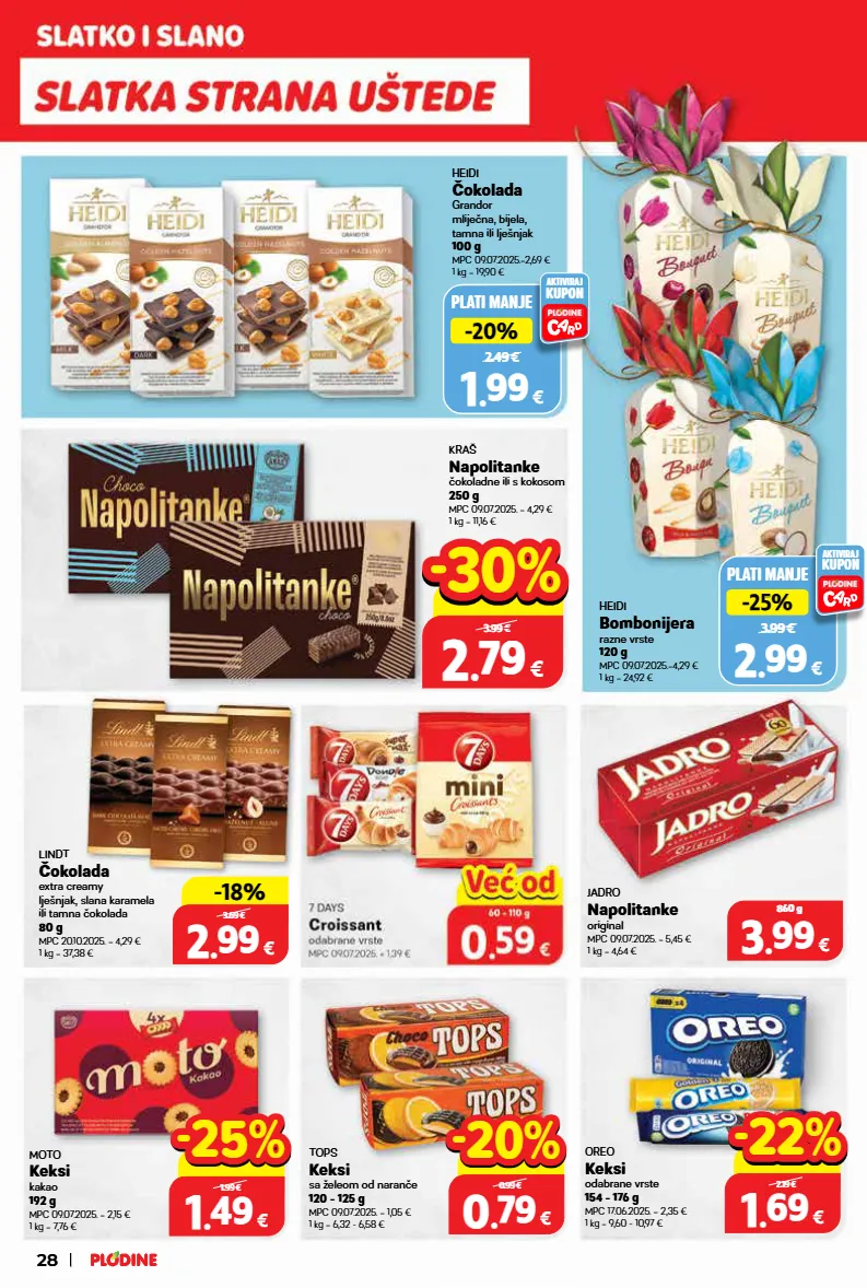 kraš napolitanke čokoladne ili s kokosom 250 g mpc 09.07.2025. = 4,29 € 1 kg = 11,16 € lindt čokolada extra creamy lješnjak, slana karamela ili tamna čokolada 80 g mpc 20.10.2025. = 4,29 € 1 kg = 37,38 € jadro napolitanke original mpc 09.07.2025. = 5,45 € 1 kg = 4,64 € 2 2 . . 99 99 € 80 g -18% -18% 3.69 € 3 3 . . 99 99 € 860 g 2 2 . . 79 79 € 250 g 3.99 € -30% -30% plati manje 2.49 € -20% -20% 1 1 . . 99 99 € aktiviraj kupon heidi čokolada grandor mliječna, bijela, tamna ili lješnjak 100 g mpc 09.07.2025.=2,69 € 1 kg = 19,90 € moto keksi kakao 192 g mpc 09.07.2025. = 2,15 € 1 kg = 7,76 € tops keksi sa želeom od naranče 120 - 125 g mpc 09.07.2025. = 1,05 € 1 kg = 6,32 - 6,58 € oreo keksi odabrane vrste 154 - 176 g mpc 17.06.2025. = 2,35 € 1 kg = 9,60 - 10,97 € plati manje 3.99 € -25% -25% 2 2 . . 99 99 € aktiviraj kupon heidi bombonijera razne vrste 120 g mpc 09.07.2025.=4,29 € 1 kg = 24,92 € 1 1 . . 49 49 € 192 g 1.99 € -25% -25% 1 1 . . 69 69 € 154 - 176 g 2.19 € -22% -22% 0 0 . . 79 79 € 120 - 125 g 0.99 € -20% -20% 28 28