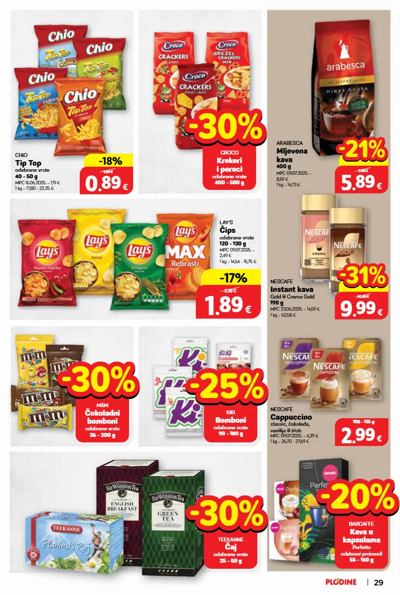 arabesca mljevena kava 400 g mpc 09.07.2025. = 8,59 € 1 kg = 14,73 € nescafe instant kava gold ili crema gold 190 g mpc 23.06.2025. = 14,59 € 1 kg = 52,58 € lay’s čips odabrane vrste 120 - 130 g mpc 09.07.2025. = 2,49 € 1 kg = 14,54 - 15,75 € nescafe cappuccino classic, čokolada, vanilija ili irish mpc 09.07.2025. = 4,39 € 1 kg = 26,70 - 27,69 € 2 2 . . 99 99 € 108 - 125 g 1 1 . . 89 89 € 120 - 130 g -17% -17% 2.29 € -30% -30% croco krekeri i pereci odabrane vrste 400 - 500 g -25% -25% kiki bomboni odabrane vrste 90 - 180 g 5 5 . . 89 89 € 400 g 7.49 € -21% -21% 9 9 . . 99 99 € 190 - 210 g 14.49 € -31% -31% chio tip top odabrane vrste 40 - 50 g mpc 16.06.2025. = 1,19 € 1 kg = 17,80 - 22,25 € 0 0 . . 89 89 € 40 - 50 g -18% -18% 1.09 € -20% -20% barcaffe kava u kapsulama perfetto odabrani proizvodi 55 - 160 g -30% -30% m&m čokoladni bomboni odabrane vrste 36 - 200 g -30% -30% teekanne čaj odabrane vrste 25 - 50 g 29
