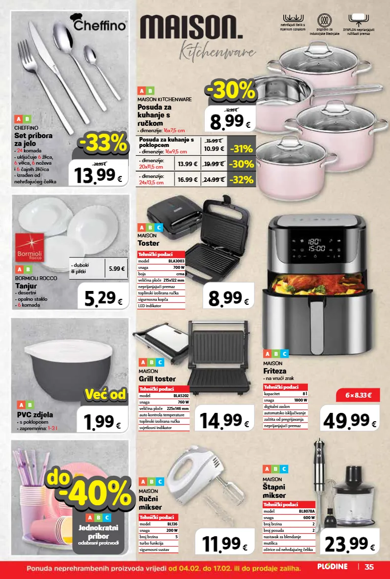 -32% 16.99 € 24.99 € • dimenzije: 24x13,5 cm -30% 13.99 € 19.99 € • dimenzije: 20x11,5 cm -31% 10.99 € 15.99 € posuda za kuhanje s poklopcem • dimenzije: 16x9,5 cm • duboki ili plitki 5.99 € tehnički podaci model bla5202 snaga 760 w veličina ploče 225x146 mm auto kontrola temperature toplinski izolirana ručka svjetlosni indikator 5 5 . . 29 29 € 8 8 . . 99 99 € top cijena! već od hit cijena! super prilika! 13 13 . . 99 99 € xxxxx samo u plodinama 20.99 € -33% -33% 14 14 . . 99 99 € 49 49 . . 99 99 € 23 23 . . 99 99 € 2.99 € 1 1 . . 99 99 € već od već od 11 11 . . 99 99 € 6 × 8.33 € 8 8 . . 99 99 € 12.99 € -30% -30% 35 nehrđajući čelik s mjernom oznakom pogodno za indukcijske štednjake xynflon neprianjajući ružičasti premaz a b maison kitchenware posuda za kuhanje s ručkom • dimenzije: 16x7,5 cm -40% -40% a b c jednokratni pribor odabrani proizvodi do do bormioli rocco tanjur • desertni • opalno staklo • 6 komada a b maison ručni mikser a b c maison štapni mikser a b c maison grill toster a b c maison toster a b c tehnički podaci model bl136 snaga 200 w broj brzina 5 turbo funkcija sigurnosni sustav tehnički podaci model bl807ba snaga 600 w broj brzina 2 broj posuda 2 nastavak za blendanje mutilica oštrice od nehrđajućeg čelika tehnički podaci model bla3003 snaga 700 w boja crna veličina ploče 215x122 mm neprijanjajući premaz toplinski izolirana ručka sigurnosna kopča led indikator maison friteza • na vrući zrak a b c tehnički podaci kapacitet 8 l snaga 1800 w digitalni zaslon automatsko isključivanje zaštita od pregrijavanja neprijanjajući premaz cheffino set pribora za jelo • 24 komada • uključuje 6 žlica, 6 vilica, 6 noževa i 6 čajnih žličica • izrađen od nehrđajućeg čelika a b pvc zdjela • s poklopcem • zapremnina: 1-3 l a b