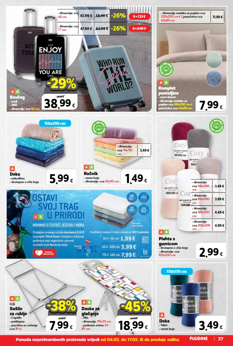 • dimenzije navlaka za poplun cca 200x200 cm i 2 jastučnice cca 60x80 cm 11.99 € • dimenzije: cca 70x130 cm 3.49 € • dimenzije: cca 180x200 cm 4.49 € • dimenzije: cca 200x200 cm 4.99 € • dimenzije: cca 160x200 cm 3.99 € • dimenzije: cca 140x200 cm 3.49 € 3 3 . . 49 49 € 1 1 . . 49 49 € 7 7 . . 99 99 € 2 2 . . 99 99 € 5 5 . . 99 99 € 6 × 7.33 € 6 × 8.00 € kovčeg • tvrdi • abs • dimenzije: cca 55 cm a b top cijena! već od hit cijena! super prilika! 38 38 . . 99 99 € xxxxx samo u plodinama 54.99 € -29% -29% 7 7 . . 99 99 € 12.99 € -38% -38% top cijena! već od hit cijena! super prilika! 18 18 . . 99 99 € xxxxx samo u plodinama 34.99 € -45% -45% ponuda neprehrambenih proizvoda vrijedi od 04.02. do 17.02. ili do prodaje zaliha. • 1 0 0 % p a m u k • 1 0 0 % p a m u k • 1 0 0 % p a m u k • 1 0 0 % p a m u k • 1 0 0 % p a m u k • 1 0 0 % p a m u k • 1 0 0 % p a m u k • 1 0 0 % p a m u k • 1 0 0 % p a m u k 130x170 cm 150x200 cm 37 -26% 43.99 € 59.99 € • dimenzije: cca 68 cm -26% 47.99 € 64.99 € • dimenzije: cca 77 cm ručnik • razne boje • dimenzije: cca 50x90 cm a b plahta s gumicom • dostupna u više boja • dimenzije: cca 100x200 cm a b komplet posteljine • razni dezeni • dimenzije navlake za poplun cca 140x200 cm i jastučnice cca 60x80 cm a b deka • mikrofibra • dostupna u više boja a deka • felpa • razne boje a daska za glačanje • alfa • dimenzije: 110x33 cm • podesiva visina: 69 - 89 cm a b ege sušilo za rublje • capello • preklopno • površina za sušenje: cca 18 m a b