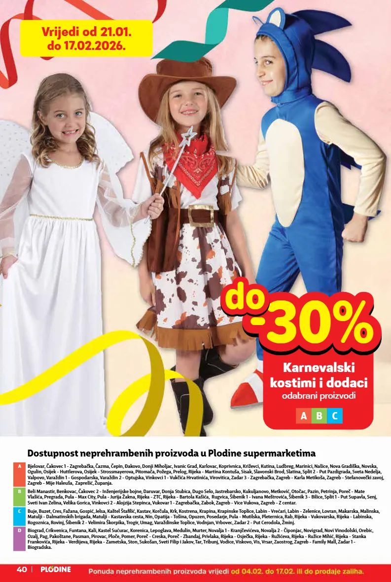 Beli Manastir, Benkovac, Čakovec 2 - Inženjerijske bojne, Daruvar, Donja Stubica, Dugo Selo, Jastrebarsko, Kukuljanovo, Metković, Otočac, Pazin, Petrinja, Poreč - Mate Vlašića, Pregrada, Pula - Max City, Pula - Jurija Žakna, Rijeka - ZTC, Rijeka - Bartola Kašića, Rugvica, Šibenik 1 - Ivana Meštrovića, Šibenik 3 - Bilice, Split 1 - Put Supavla, Senj, Sveti Ivan Zelina, Velika Gorica, Vinkovci 2 - Alojzija Stepinca, Vukovar 1 - Zagrebačka, Zabok, Zagreb - Vice Vukova, Zagreb - Z centar. B Buje, Buzet, Cres, Fažana, Gospić, Jelsa, Kaštel Štafilić, Kastav, Korčula, Krk, Kostrena, Krapina, Krapinske Toplice, Labin - Vrećari, Labin - Zelenice, Lovran, Makarska, Malinska, Matulji - Dalmatinskih brigada, Matulji - Kastavska cesta, Nin, Opatija - Tošina, Opuzen, Posedarje, Pula - Mutilska, Pleternica, Rab, Rijeka - Vukovarska, Rijeka - Labinska, Rogoznica, Rovinj, Šibenik 2 - Velimira Škorpika, Trogir, Umag, Varaždinske Toplice, Vodnjan, Vrbovec, Zadar 2 - Put Cerodola, Žminj. C Biograd, Crikvenica, Funtana, Kali, Kastel Sućurac, Korenica, Lepoglava, Medulin, Murter, Novalja 1 - Kranjčevićeva, Novalja 2 - Čiponjac, Novigrad, Novi Vinodolski, Orebic, Ozalj, Pag, Pakoštane, Pasman, Pirovac, Ploče, Pomer, Poreč - Creska, Poreč - Zbandaj, Privlaka, Rijeka - Osječka, Rijeka - Ružićeva, Rijeka - Ružice Mihić, Rijeka - Stanka Frankovića, Rijeka - Verdijeva, Rijeka - Zametska, Ston, Sukošan, Sveti Filip i Jakov, Tar, Tribunj, Vodice, Viskovo, Vis, Vrsar, Zaostrog, Zagreb - Family Mall, Zadar 1 - Biogradska. D A Bjelovar, Čakovec 1 - Zagrebačka, Čazma, Čepin, Đakovo, Donji Miholjac, Ivanic Grad, Karlovac, Koprivnica, Križevci, Kutina, Ludbreg, Marinici, Našice, Nova Gradiška, Novska, Ogulin, Osijek - Huttlerova, Osijek - Strossmayerova, Pitomača, Požega, Prelog, Rijeka - Martina Kontuša, Sisak, Slavonski Brod, Slatina, Split 2 - Put Pazdigrada, Sveta Nedelja, Valpovo, Varaždin 1 - Gospodarska, Varaždin 2 - Optujska, Vinkovci 1 - Vukčića Hrvatinića, Virovitica, Zadar 3 - Zagrebačka, Zagreb - Karla Metikoša, Zagreb - Stefanovečki zavoj, Zagreb - Mije Haleuša, Zaprešić, Županja. Dostupnost neprehrambenih proizvoda u Plodine supermarketima 40 Vrijedi od 21.01. do 17.02.2026. Karnevalski kostimi i dodaci odabrani proizvodi -30% -30% do do A B C