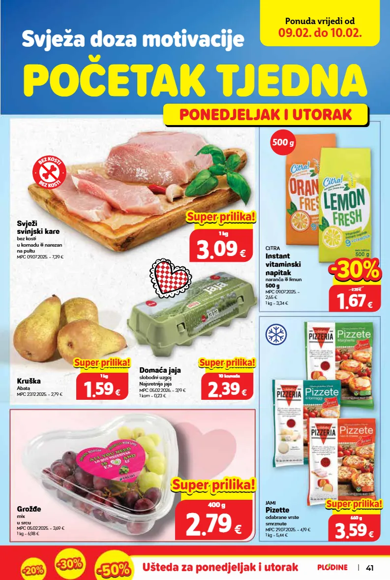 početak tjedna svježa doza motivacije ponedjeljak i utorak ponuda vrijedi od 09.02. do 10.02. kruška abata mpc 23.12.2025. = 2,79 € svježi svinjski kare bez kosti u komadu ili narezan na pultu mpc 09.07.2025. = 7,39 € grožđe mix u srcu mpc 05.02.2025. = 3,69 € 1 kg = 6,98 € domaća jaja slobodni uzgoj najsretnija jaja mpc 05.02.2026. = 3,19 € 1 kom = 0,23 € jami pizette odabrane vrste smrznute mpc 29.07.2025. = 4,19 € 1 kg = 5,44 € ušteda za ponedjeljak i utorak citra instant vitaminski napitak naranča ili limun 500 g mpc 09.07.2025. = 2,65 € 1 kg = 3,34 € 1 1 . . 67 67 € 500 g 2.39 € -30% -30% 0.00 € 3 3 . . 59 59 € 660 g super prilika! super prilika! 0.00 € 2 2 . . 79 79 € 400 g super prilika! super prilika! 0.00 € 3 3 . . 09 09 € 1 kg super prilika! super prilika! 0.00 € 1 1 . . 59 59 € 1 kg super prilika! super prilika! 0.00 € 2 2 . . 39 39 € 10 komada super prilika! super prilika! 500 g b e z k o s t i b e z k o s t i 41