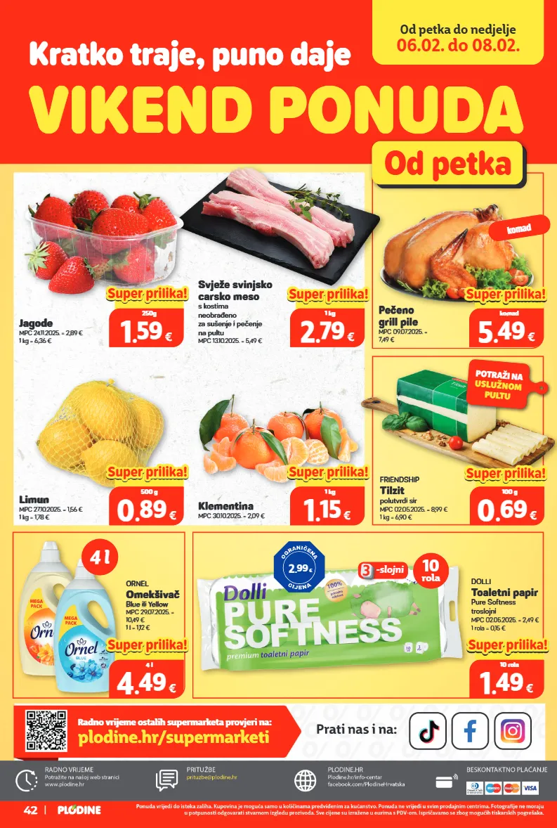 radno vrijeme ostalih supermarketa provjeri na: plodine.hr/supermarketi od petka do nedjelje 06.02. do 08.02. vikend ponuda od petka kratko traje, puno daje svježe svinjsko carsko meso s kostima neobrađeno za sušenje i pečenje na pultu mpc 13.10.2025. = 5,49 € limun mpc 27.10.2025. = 1,56 € 1 kg = 1,78 € klementina mpc 30.10.2025. = 2,09 € jagode mpc 24.11.2025. = 2,89 € 1 kg = 6,36 € friendship tilzit polutvrdi sir mpc 02.05.2025. = 8,99 € 1 kg = 6,90 € dolli toaletni papir pure softness troslojni mpc 02.05.2025. = 2,49 € 1 rola = 0,15 € pečeno grill pile mpc 09.07.2025. = 7,49 € ornel omekšivač blue ili yellow mpc 29.07.2025. = 10,49 € 1 l = 1,12 € 0.00 € 4 4 . . 49 49 € 4 l super prilika! super prilika! 0.00 € 0 0 . . 89 89 € 500 g super prilika! super prilika! 0.00 € 1 1 . . 59 59 € 250g super prilika! super prilika! 0.00 € 1 1 . . 49 49 € 10 rola super prilika! super prilika! 0.00 € 1 1 . . 15 15 € 1 kg super prilika! super prilika! 0.00 € 2 2 . . 79 79 € 1 kg super prilika! super prilika! 0.00 € 5 5 . . 49 49 € komad super prilika! super prilika! 0.00 € 0 0 . . 69 69 € 100 g super prilika! super prilika! 2 . 99 € potraži na uslužnom pultu 4 l -slojni 3 10 rola komad 42