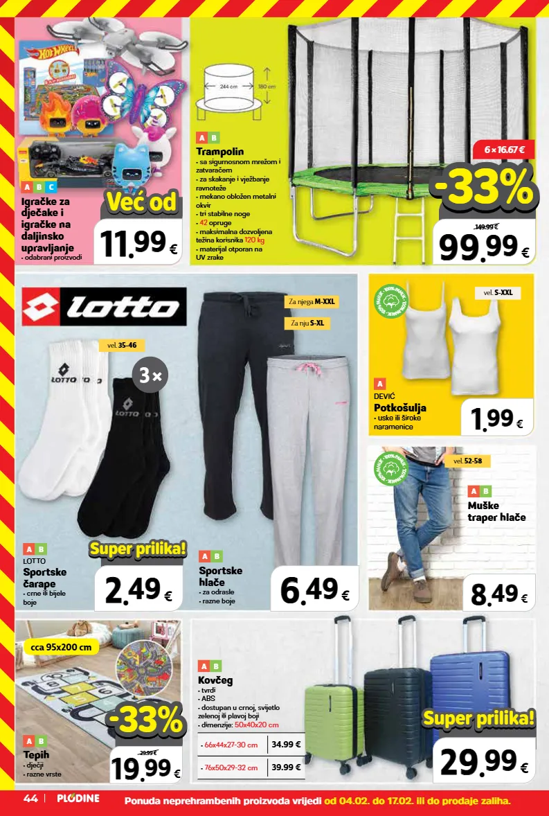 a b tepih • dječji • razne vrste a b c igračke za dječake i igračke na daljinsko upravljanje • odabrani proizvodi a b muške traper hlače a dević potkošulja • uske ili široke naramenice a b trampolin • sa sigurnosnom mrežom i zatvaračem • za skakanje i vježbanje ravnoteže • mekano obložen metalni okvir • tri stabilne noge • 42 opruge • maksimalna dozvoljena težina korisnika 120 kg • materijal otporan na uv zrake a b kovčeg • tvrdi • abs • dostupan u crnoj, svijetlo zelenoj ili plavoj boji • dimenzije: 50x40x20 cm 1 1 . . 99 99 € a b lotto sportske čarape • crne ili bijele boje a b sportske hlače • za odrasle • razne boje 0.00 € 11 11 . . 99 99 € već od već od 39.99 € • 76x50x29-32 cm 34.99 € • 66x44x27-30 cm 8 8 . . 49 49 € 6 6 . . 49 49 € 19 19 . . 99 99 € 29.99 € -33% -33% • 1 0 0 % p a m u k • 1 0 0 % p a m u k • 1 0 0 % p a m u k • 1 0 0 % p a m u k • 1 0 0 % p a m u k • 1 0 0 % p a m u k 0.00 € 2 2 . . 49 49 € super prilika! super prilika! 0% 0% 0.00 € top cijena! već od hit cijena! 29 29 . . 99 99 € super prilika! super prilika! top cijena! već od hit cijena! super prilika! 99 99 . . 99 99 € samo u plodinama 149.99 € -33% -33% ponuda neprehrambenih proizvoda vrijedi od 04.02. do 17.02. ili do prodaje zaliha. cca 95x200 cm vel. 35-46 vel. s-xxl vel. 52-58 za nju s-xl za njega m-xxl 6 × 16.67 € 3 × 44