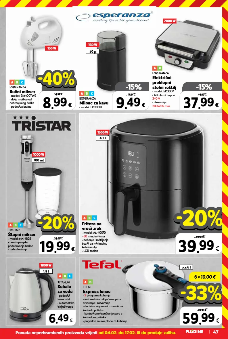 top cijena! već od hit cijena! super prilika! 59 59 . . 99 99 € samo u plodinama 89.99 € -33% -33% top cijena! već od hit cijena! super prilika! 39 39 . . 99 99 € samo u plodinama 49.99 € -20% -20% top cijena! već od hit cijena! super prilika! 37 37 . . 99 99 € samo u plodinama -15% -15% 44.99 € 6 × 10.00 € 1800 w 1,8 l 1000 w 700 ml 2000 w 1300 w 4,2 l 160 w 150 w cca 6 l 50 g ponuda neprehrambenih proizvoda vrijedi od 04.02. do 17.02. ili do prodaje zaliha. 47 19 19 . . 99 99 € 24.99 € -20% -20% a b c esperanza ručni mikser • model: ekm007we • dvije metlice od nehrđajućeg čelika • podesiva brzina a b tefal express lonac • 2 programa kuhanja • automatsko zaključavanje za otvaranje i zatvaranje • dodatna sigurnost uz ventil za kontrolu pritiska • kontrolirano ispuštanje pare s kontrolom pritiska • pogodno za sve ploče za kuhanje a b c tristar štapni mikser • model: mx-4828 • bezstupanjsko podešavanje brzine • turbo funkcija a b esperanza električni preklopni stolni roštilj • model: ekg007 • ac ulazni napon: 240 v • dimenzije: 280x235 mm a b c esperanza mlinac za kavu • model: ekc001k 9 9 . . 49 49 € -15% -15% 11.24 € a b c titanum kuhalo za vodu • podesivi termostat • automatsko isključivanje 6 6 . . 49 49 € a b c friteza na vrući zrak • model: al-4001d • 60 minutni timer • pečenje i roštiljanje bez ili uz minimalnu količinu ulja • lcd zaslon 8 8 . . 99 99 € 14.99 € -40% -40%