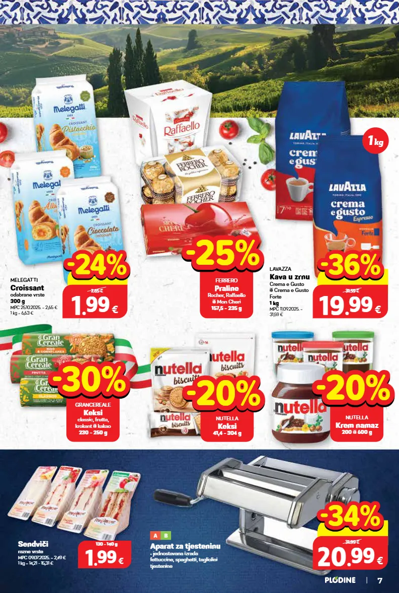 lavazza kava u zrnu crema e gusto ili crema e gusto forte 1 kg mpc 11.09.2025. = 31,59 € melegatti croissant odabrane vrste 300 g mpc 25.10.2025. = 2,65 € 1 kg = 6,63 € -30% -30% grancereale keksi classic, frutta, krokant ili kakao 230 - 250 g -20% -20% nutella keksi 41,4 - 304 g -25% -25% ferrero praline rocher, raffaello ili mon cheri 157,5 - 235 g -20% -20% nutella krem namaz 200 ili 600 g sendviči razne vrste mpc 09.07.2025. = 2,49 € 1 kg = 14,21 - 15,31 € 1 1 . . 99 99 € 130 - 140 g top cijena! već od hit cijena! super prilika! 20 20 . . 99 99 € xxxxx samo u plodinama 31.99 € -34% -34% top cijena! već od hit cijena! super prilika! 19 19 . . 99 99 € xxxxx samo u plodinama 31.59 € -36% -36% 1 1 . . 99 99 € 300 g 2.65 € -24% -24% 1 kg 7 aparat za tjesteninu • jednostavana izrada fettuccine, spaghetti, tagliolini tjestenine a b