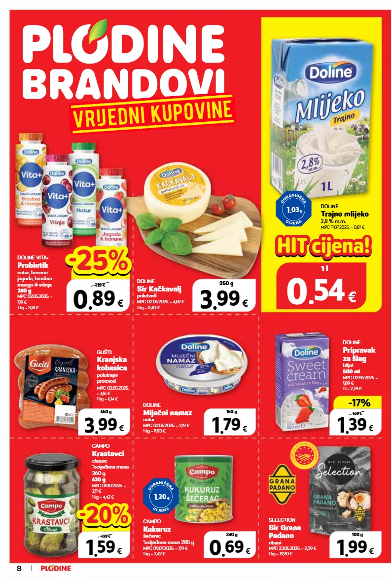 doline vita+ probiotik natur, banana- jagoda, breskva- mango ili višnja 280 g mpc 02.05.2025. = 1,19 € 1 kg = 3,18 € selection sir grana padano ribani mpc 23.05.2025. = 2,39 € 1 kg = 19,90 € 1 1 . . 99 99 € 100 g doline trajno mlijeko 2,8 % m.m. mpc 11.07.2025. = 0,81 € doline sir kačkavalj polutvrdi mpc 02.05.2025. = 4,59 € 1 kg = 11,40 € 3 3 . . 99 99 € 350 g doline pripravak za šlag biljni 500 ml mpc 02.05.2025. = 1,89 € 1 l = 2,78 € 1 1 . . 39 39 € 500 ml -17% -17% 1.69 € campo kukuruz šećerac *ocijeđene mase 285 g mpc 09.07.2025. = 1,19 € 1 kg = 2,42 € gušti kranjska kobasica polutrajni proizvod mpc 02.05.2025. = 4,16 € 1 kg = 6,14 € 0 0 . . 69 69 € 340 g 3 3 . . 99 99 € 650 g campo krastavci classic *ocijeđena masa 360 g 620 g mpc 08.10.2025. = 2,11 € 1 kg = 4,42 € doline miječni namaz natur mpc 02.05.2025. = 2,19 € 1 kg = 11,93 € 1 1 . . 79 79 € 150 g 0 0 . . 89 89 € 280 g 1.19 € -25% -25% 1 1 . . 59 59 € 1.99 € -20% -20% 8.02 € 0 0 . . 54 54 € 1 l hit hit cijena! cijena! 1 . 03 € 1 . 20 € 8
