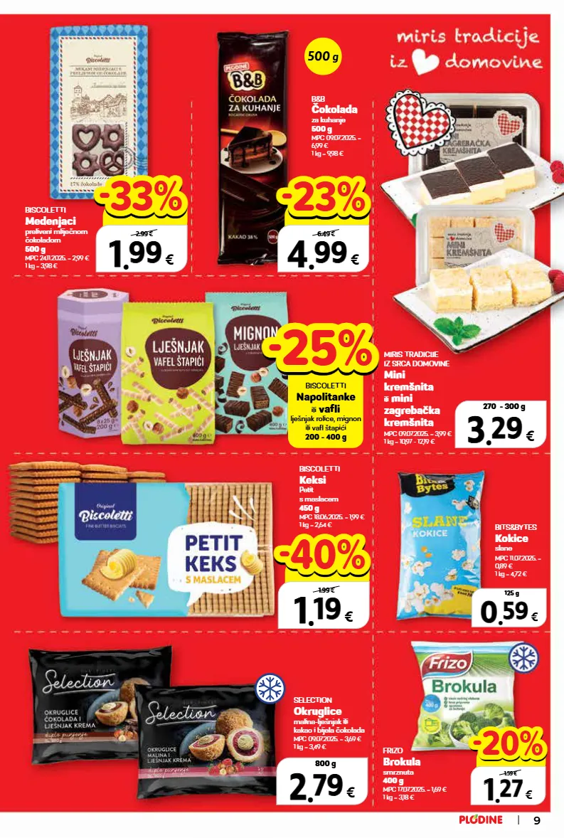 miris tradicije iz srca domovine mini kremšnita ili mini zagrebačka kremšnita mpc 09.07.2025. = 3,99 € 1 kg = 10,97 - 12,19 € 3 3 . . 29 29 € 270 - 300 g b&b čokolada za kuhanje 500 g mpc 09.07.2025. = 6,99 € 1 kg = 9,98 € biscoletti medenjaci preliveni mliječnom čokoladom 500 g mpc 24.11.2025. = 2,99 € 1 kg = 3,98 € -25% -25% biscoletti napolitanke ili vafli lješnjak rolice, mignon ili vafl štapići 200 - 400 g frizo brokula smrznuta 400 g mpc 17.07.2025. = 1,69 € 1 kg = 3,18 € 1 1 . . 27 27 € 400 g 1.59 € -20% -20% 4 4 . . 99 99 € 500 g 6.49 € -23% -23% 1 1 . . 99 99 € 500 g 2.99 € -33% -33% bits&bytes kokice slane mpc 11.07.2025. = 0,89 € 1 kg = 4,72 € 0 0 . . 59 59 € 125 g selection okruglice malina-lješnjak ili kakao i bijela čokolada mpc 09.07.2025. = 3,69 € 1 kg = 3,49 € 2 2 . . 79 79 € 800 g biscoletti keksi petit s maslacem 450 g mpc 18.06.2025. = 1,99 € 1 kg = 2,64 € 1 1 . . 19 19 € 450 g 1.99 € -40% -40% 500 g 9