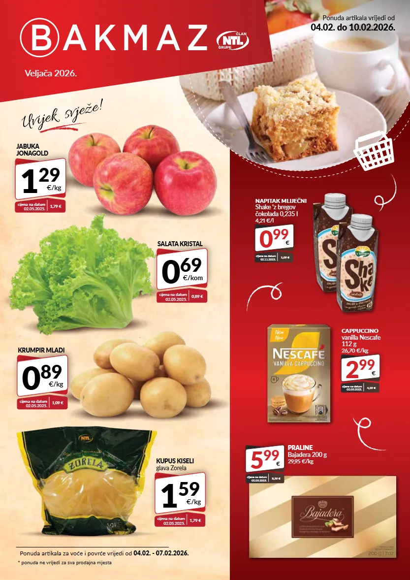 ponuda artikala za voće i povrće vrijedi od 04.02. - 07.02.2026. * ponuda ne vrijedi za sva prodajna mjesta veljača 2026. ponuda artikala vrijedi od 04.02. do 10.02.2026. 2 99 € cappuccino vanilla nescafe 112 g 26,70 €/kg cijena na datum 02.05.2025. 4,29 € 0 99 € napitak mliječni shake 'z bregov čokolada 0,235 l 4,21 €/l cijena na datum 02.11.2025. 1,39 € cijena na datum 02.05.2025. 8,59 € 5 99 € praline bajadera 200 g 29,95 €/kg cijena na datum 02.05.2025. 1,79 € jabuka jonagold 1 29 €/kg krumpir mladi 0 89 €/kg cijena na datum 02.05.2025. 1,09 € cijena na datum 02.05.2025. 1,79 € kupus kiseli glava zorela 1 59 €/kg salata kristal 0 69 €/kom cijena na datum 02.05.2025. 0,89 €
