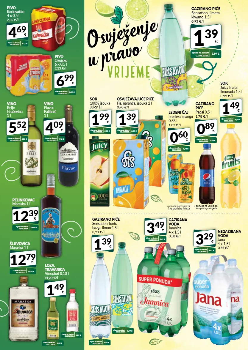 1 99 € sok 100% jabuka juicy 1 l cijena na datum 02.05.2025. 2,59 € 3 29 € negazirana voda jana 4 x 1,5 l 0,55 €/l cijena na datum 02.05.2025. 4,31 € 1 39 € osvježavajuće piće fis, naranča, jabuka 2 l 0,70 €/l cijena na datum 02.05.2025. 2,39 € ledeni čaj breskva, mango 0,33 l 1,82 €/l 0 60 € cijena na datum 02.05.2025. 0,95 € * ponuda ne vrijedi za sva prodajna mjesta sok juicy fruits limunada 1,5 l 0,99 €/l 1 49 € cijena na datum 02.05.2025. 1,99 € gazirano piće sensation tonic, bazga limun 1,5 l 0,93 €/l 1 39 € cijena na datum 02.05.2025. 1,99 € cijena na datum 02.05.2025. 1,97 € gazirano piće pepsi 0,5 l 1,78 €/l 0 89 € cijena na datum 02.05.2025. 1,10 € * ponuda ne vrijedi za sva prodajna mjesta 3 49 € gazirana voda jamnica 4 x 1,5 l 0,58 €/l cijena na datum 02.05.2025. 4,31 € cijena na datum 02.05.2025. 15,99 € pelinkovac maraska 1 l 12 39 € cijena na datum 02.05.2025. 16,52 € šljivovica maraska 1 l 12 79 € 5 52 € vino belje graševina 1 l cijena na datum 02.05.2025. 6,99 € 4 09 € vino plavac palihnić 1 l cijena na datum 02.05.2025. 5,42 € 4 69 € pivo karlovačko 4 x 0,5 l 2,35 €/l cijena na datum 02.05.2025. 5,77 € 6 99 € pivo ožujsko 6 x 0,5 l 2,33 €/l cijena na datum 02.05.2025. 8,47 € 1 49 € loza, travarica vinoplod 0,10 l 14,90 €/l cijena na datum 02.05.2025. 2,29 € cijena na datum 02.05.2025. 1,95 € gazirano piće sensation limeta kiwano 1,5 l 0,93 €/l 1 39 € cijena na datum 02.05.2025. 1,99 € osvježenje u pravo vrijeme