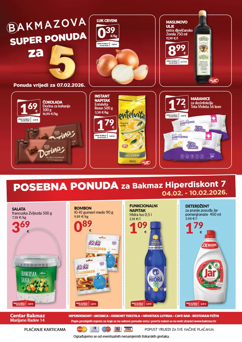 b a k m a z o va super ponuda za ponuda vrijedi za 07.02.2026. kapsule macchiato, cappuccino franck 198 g 161,56 kn/kg 21,44 €/kg 31 99 kn 4,25 € plaćanje karticama ograđujemo se od eventualnih nenamjernih tiskarskih grešaka. popust vrijedi za sve načine plaćanja centar bakmaz marijane radev 14 hiperdiskont • mesnica • diskont tekstila • hrvatska lutrija • cafe bar - restoran fešta popis prodajnih mjesta na koje se ne odnosi ponuda voća i povrća nalazi se na web stranici www.bakmaz.hr 04.02. - 10.02.2026. posebna ponuda za bakmaz hiperdiskont 7 cijena na datum 02.05.2025. 1,35 € instant napitak entelvita limun 500 g 3,58 €/kg 1 79 € cijena na datum 02.05.2025. 2,59 € maslinovo ulje extra djevičansko zorela 750 ml 11,99 €/l 8 99 € cijena na datum 02.05.2025. 12,79 € luk crveni 0 39 €/kg cijena na datum 02.05.2025. 0,84 € čokolada dorina za kuhanje 100 g 16,90 €/kg 1 69 € cijena na datum 02.05.2025. 2,20 € 1 09 € funkcionalni napitak hidra iso 0,5 l 2,18 €/l cijena na datum 02.05.2025. 1,55 € deterdžent za pranje posuđa jar pomergranate 450 ml 3,98 €/l 1 79 € cijena na datum 02.05.2025. 2,49 € ntl robna marka ntl robna marka maramice za dezinfekciju teta violeta 56 kom 1 72 € cijena na datum 02.05.2025. 3,59 € cijena na datum 02.05.2025. 4,99 € bombon ki-ki gumeni medo 90 g 9,89 €/kg 0 89 € salata francuska zvijezda 500 g 7,38 €/kg 3 69 €