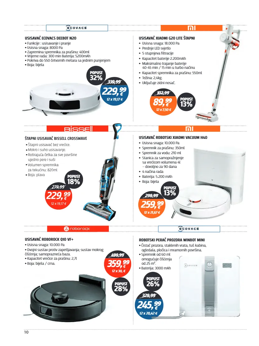 10 usisavač ecovacs deebot n20 • funkcije : usisavanje i pranje usisna snaga: 8000 pa • zapremina spremnika za prašinu: 400ml • vrijeme rada: 300 min baterija: 5200mah • pokriva do 550 četvornih metara sa jednim punjenjem • • boja: bijela 339,99 229,⁹⁹ € 12 x 19,17 € popust 32% • • • • • robotski perač prozora winbot mini • čistač prozora, staklenih vrata, tuš kabina, ogledala, pločica i mramornih površina. spremnik od 60 ml • omogućuje čišćenja od 25 m². baterija: 3000 mah • 329,99 245,⁹⁹ € 12 x 20,42 € popust 26% usisavač xiaomi g20 lite štapni • usisna snaga: 18.000 pa • prednje led svjetlo • 5 stupnjeva filtracije • kapacitet baterije 2.200mah • maksimalno trajanje baterije 40-45 min / 15 min u turbo načinu • kapacitet spremnika za prašinu: 550ml • težina: 2,4kg. • uključuje zidni nosač. 102,99 89,⁹⁹ € 12 x 7,50 € popust 13% usisavač robotski xiaomi vacuum h40 • usisna snaga: 10.000 pa • spremnik za prašinu: 350ml • spremnik za vodu: 210 ml • stanica za samopražnjenje sa vrećicom volumena 4l – dovoljno za 90 dana • 4 načina rada • baterija: 5.200 mah • boja: bijela 299,99 259,⁹⁹ € popust 13% usisavač roborock q10 vf+ • usisna snaga: 10.000 pa • dvojni sustav protiv zapetljavanja; sustav mokrog čišćenja; samoprazneća baza. kapacitet vrećice za prašinu: 2,7l • • boja: bijela / crna. ušteda 18€ popust 18% popust 28 % 499,99 359,⁹⁹ 12 x 21,67 € 12 x 30, €
