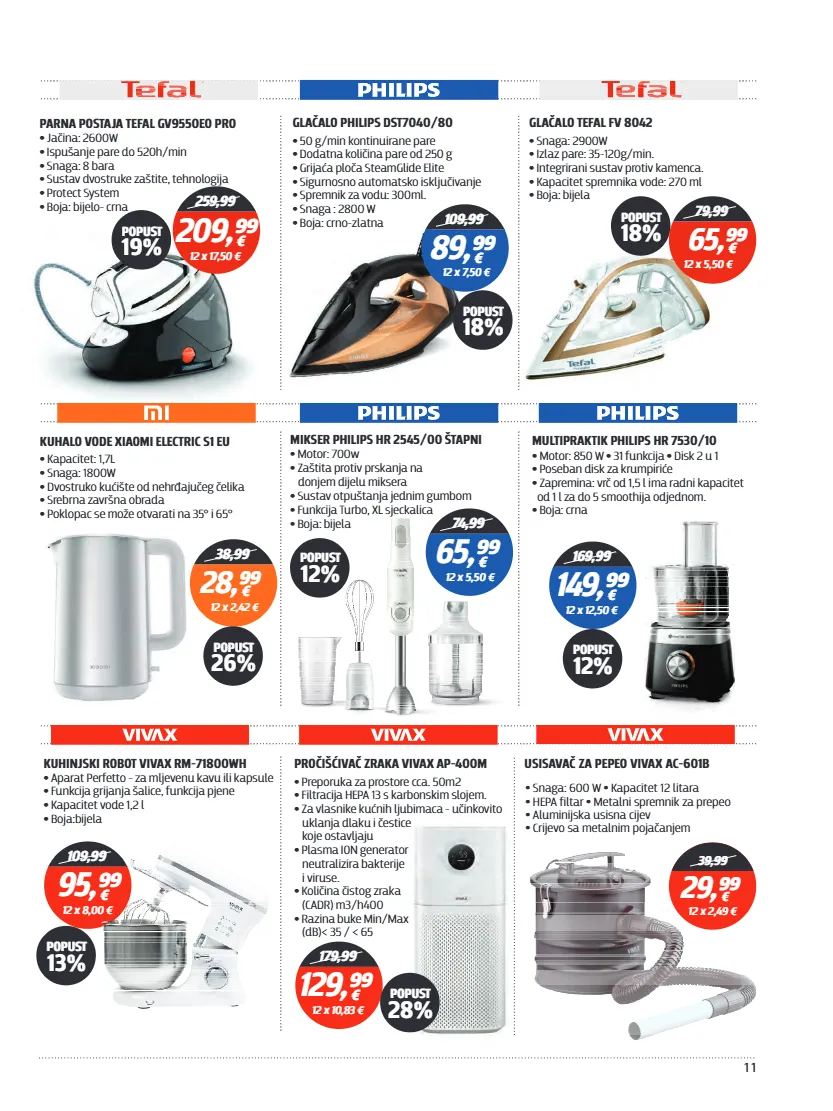 11 259,99 209,⁹⁹ € 12 x 17,50 € popust 19% parna postaja tefal gv9550eo pro • jačina: 2600w • ispušanje pare do 520h/min • snaga: 8 bara • sustav dvostruke zaštite, tehnologija • protect system • boja: bijelo- crna popust 18% glačalo tefal fv 8042 • snaga: 2900w • izlaz pare: 35-120g/min. • integrirani sustav protiv kamenca. • kapacitet spremnika vode: 270 ml • boja: bijela 79,99 65,⁹⁹ € 12 x 5,50 € mikser philips hr 2545/00 štapni • motor: 700w zaštita protiv prskanja na • donjem dijelu miksera sustav otpuštanja jednim gumbom • funkcija turbo, xl sjeckalica • boja: bijela • 74,99 65,⁹⁹ € 12 x 5,50 € popust 12% multipraktik philips hr 7530/10 • • • motor: 850 w 31 funkcija disk 2 u 1 poseban disk za krumpiriće • zapremina: vrč od 1,5 l ima radni kapacitet • od 1 l za do 5 smoothija odjednom. boja: crna • 169,99 149,⁹⁹ € 12 x 12,50 € popust 12% kuhinjski robot vivax rm-71800wh • aparat perfetto - za mljevenu kavu ili kapsule funkcija grijanja šalice, funkcija pjene • • kapacitet vode 1,2 l boja:bijela • 109,99 95,⁹⁹ € 12 x 8,00 € popust 13% usisavač za pepeo vivax ac-601b • • snaga: 600 w kapacitet 12 litara • • hepa filtar metalni spremnik za prepeo • aluminijska usisna cijev • crijevo sa metalnim pojačanjem 39,99 29,⁹⁹ € 12 x 2,49 € glačalo philips dst7040/80 • 50 g/min kontinuirane pare • dodatna količina pare od 250 g • grijaća ploča steamglide elite • sigurnosno automatsko isključivanje • spremnik za vodu: 300ml. • snaga : 2800 w • boja: crno-zlatna 109,99 89,⁹⁹ € 12 x 7,50 € popust 18% kuhalo vode xiaomi electric s1 eu • kapacitet: 1,7l • snaga: 1800w • dvostruko kućište od nehrđajučeg čelika • srebrna završna obrada • poklopac se može otvarati na 35° i 65° 38,99 28,⁹⁹ € 12 x 2,42 € popust 26% pročišćivač zraka vivax ap-400m • preporuka za prostore cca. 50m2 • filtracija hepa 13 s karbonskim slojem. • za vlasnike kućnih ljubimaca - učinkovito uklanja dlaku i čestice koje ostavljaju • plasma ion generator neutralizira bakterije i viruse. • količina čistog zraka (cadr) m3/h400 • razina buke min/max (db)< 35 / < 65 179,99 129,⁹⁹ € 12 x 10,83 € popust 28%