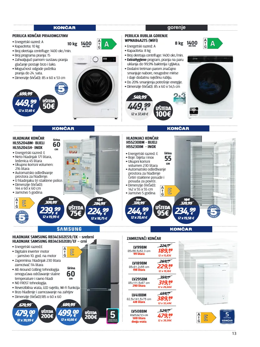13 perilica rublja gorenje wpna84a2ts (wifi) • energetski razred: a kapaciteta: 8 kg • broj okretaja centrifuge: 1400 okr./min. • program, pranja na paru • extrahygiene uklanja do 99,9% bakterija i gljivica. dodatni tretman parom značajno • smanjuje nabore, neugodne mirise i daje dodatnu svježinu rublju. do 20% smanjenja potrošnje energije. • dimenzije (vxšxd): 85 x 60 x 54,5 cm • ušteda 100€ 8 kg 1400 okr/min 549,99 449 ,⁹⁹ € 12 x 37,49 € • energetski razred: e neto hladnjak 171 litara, • ledenica 45 litara ukupno korisni volumen: • 216 litara automatsko odleđivanje • prostora za hlađenje. u hladnjaku tri staklene police. • dimenzije (vxšxd): • 144 x 60 x 60 cm • jamstvo 5 godina 60 širina cm hladnjak končar hl55204bm- bijeli hl55204sh- inox 309,99 247,⁹⁹ € 12 x 20,66 € sivi 309,99 239,⁹⁹ € 12 x 19,99 € inox • energetski razred:e digitalni inverter motor • – jamstvo 10. god. na motor zapremina: hladnjak 230 litara • zamrzivač 114 litara all-around colling tehnologija • omogućava održavanje stalne temperature i ravno hladi no frost tehnologija. • reverzibilna vrata, led svjetlo, wi-fi funkcija • brzo hlađenje i zamrzavanje na zahtjev • dimenzije (vxšxd):185 x 60 x 60 • cm širina 60 hladnjak samsung rb34c602es9/ek – srebrni hladnjak samsung rb34c602eb1/ef – crni € 12 x 45,83 € 679,99 479,⁰⁰ € 12 x 39,99 € ušteda 200€ € 12 x 45,83 € 699,99 499,⁰⁰ € 12 x 41,66 € ušteda 200€ € 12 x 45,83 € 679,99 479,⁰⁰ € 12 x 39,99 € zamrzivači končar lv99bm 85x56,5x52,3 cm 99 litara lv189bm 85x81,2x55 cm 198 litara lv295bm 85x111,5x67 cm 290 litara lv418bm 82,5x141,5x75 cm 418 litara 12 x 15, 83€ 189, € 99 lv508bm 83x153x73,5 cm 508 litara dvoja vrata 224, € 99 12 x 19, 16€ 229, € 99 269, € 99 12 x 26, 66€ 319, € 99 359, € 99 12 x 32, 49€ 389, € 99 459, € 99 12 x 39,99 € 479, € 99 529, € 99 hladnjaci končar h55230bm - bijeli h55230im - inox • energetski razred: e boje: bijela i inox • ukupni korisni • volumen 230 litara automatsko odleđivanje • prostora za hlađenje četiri staklene posude i posuda za povrće. dimenzije (vxšxd): • 142 x 55 x 55 cm jamstvo 5 godina • 55 širina cm 309,99 247,⁹⁹ € 12 x 20,66 € 339,99 244,⁹⁹ € 12 x 20,41 € inox perilica končar pr1410mg17inv • energetski razred: a kapaciteta: 10 kg • broj okretaja centrifuge: 1400 okr./min. • broj programa pranja: 15 • zahvaljujući parnom sustavu pranja • glačanje postaje brzo i lako. mogućnost odgode početka • pranja do 24. sata. dimenzije (vxšxd): 85 x 60 x 53 cm • 10 kg 1400 okr/min 499,99 € 12 x 37,49 € 449,⁹⁹ ušteda 50€ 299,99 239,⁹⁹ € 12 x 19,99 € bijeli 329,99 234,⁹⁹ € 12 x 19,58 € bijeli popust 20% ušteda 95€ 299,99 239,⁹⁹ € 12 x 19,99 € bijeli 294,99 224,⁹⁹ € 12 x 18,75 € bijeli popust 20% ušteda 75€