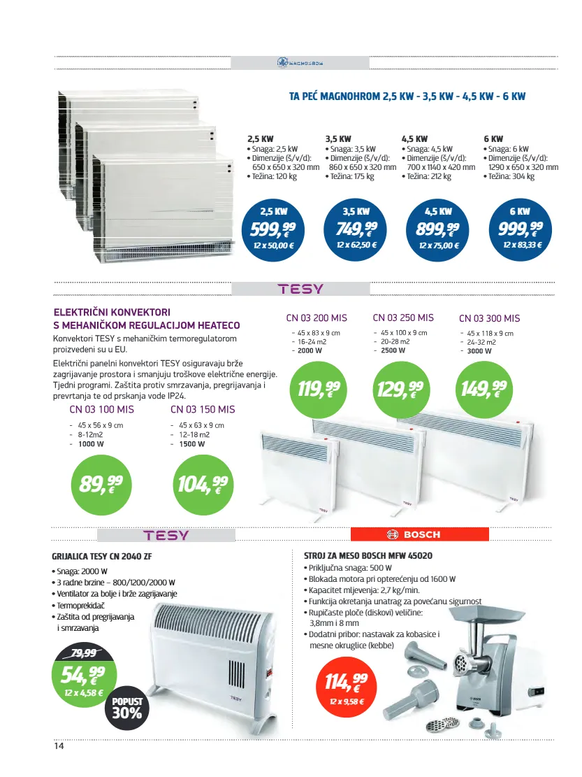 14 749,⁹⁹ € 12 x 62,50 € 599,⁹⁹ € 12 x 50,00 € 2,5 kw 3,5 kw 999,⁹⁹ € 12 x 83,33 € 899,⁹⁹ € 12 x 75,00 € 4,5 kw 6 kw 2,5 kw • snaga: 2,5 kw dimenzije (š/v/d): • 650 x 650 x 320 mm težina: 120 kg • ta peć magnohrom 2,5 kw - 3,5 kw - 4,5 kw - 6 kw • snaga: 3,5 kw dimenzije (š/v/d): • 860 x 650 x 320 mm težina: 175 kg • • snaga: 4,5 kw dimenzije (š/v/d): • 700 x 1140 x 420 mm težina: 212 kg • • snaga: 6 kw dimenzije (š/v/d): • 1290 x 650 x 320 mm težina: 304 kg • 3,5 kw 4,5 kw 6 kw 149,⁹⁹ € 129,⁹⁹ € 89,⁹⁹ € 119,⁹⁹ € 104,⁹⁹ € grijalica tesy cn 2040 zf • snaga: 2000 w • 3 radne brzine – 800/1200/2000 w • ventilator za bolje i brže zagrijavanje • termoprekidač • zaštita od pregrijavanja i smrzavanja 79,99 54,⁹⁹ € 12 x 4,58 € popust 30% stroj za meso bosch mfw 45020 • priključna snaga: 500 w blokada motora pri opterećenju od 1600 w • kapacitet mljevenja: 2,7 kg/min. • funkcija okretanja unatrag za povećanu sigurnost • rupičaste ploče (diskovi) veličine: • 3,8mm i 8 mm dodatni pribor: nastavak za kobasice i • mesne okruglice (kebbe) 114,⁹⁹ € 12 x 9,58 €