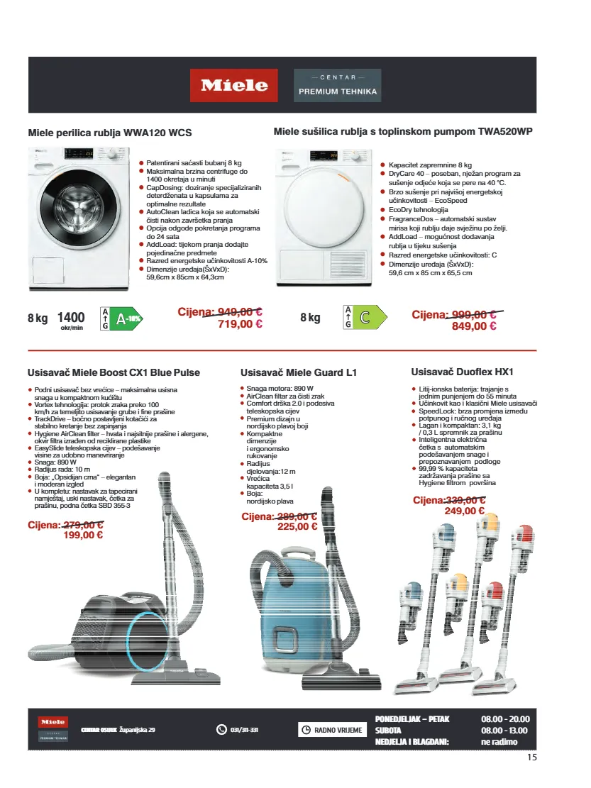 15 radno vrijeme centar osijek županijska 29 031/311-331 litij-ionska baterija: trajanje s jednim punjenjem do 55 minuta učinkovit kao i klasični miele usisavači speedlock: brza promjena između potpunog i ručnog uređaja lagan i kompaktan: 3,1 kg / 0,3 l spremnik za prašinu inteligentna električna četka s automatskim podešavanjem snage i prepoznavanjem podloge 99,99 % kapaciteta zadržavanja prašine sa hygiene filtrom površina usisavač duoflex hx1 cijena:339,00 € 249,00 € usisavač miele guard l1 snaga motora: 890 w airclean filtar za čisti zrak comfort drška 2.0 i podesiva teleskopska cijev premium dizajn u nordijsko plavoj boji kompaktne dimenzije i ergonomsko rukovanje radijus djelovanja:12 m vrećica kapaciteta 3,5 l boja: nordijsko plava cijena: 289,00 € 225,00 € usisavač miele boost cx1 blue pulse cijena: 279,00 € 199,00 € podni usisavač bez vrećice – maksimalna usisna snaga u kompaktnom kućištu vortex tehnologija: protok zraka preko 100 km/h za temeljito usisavanje grube i fine prašine trackdrive – bočno postavljeni kotačići za stabilno kretanje bez zapinjanja hygiene airclean filter – hvata i najsitnije prašine i alergene, okvir filtra izrađen od reciklirane plastike easyslide teleskopska cijev – podešavanje visine za udobno manevriranje snaga: 890 w radijus rada: 10 m boja: „opsidijan crna“ – elegantan i moderan izgled u kompletu: nastavak za tapecirani namještaj, uski nastavak, četka za prašinu, podna četka sbd 355-3 patentirani sa asti bubanj 8 kg ć maksimalna brzina centrifuge do 1400 okretaja u minuti capdosing: doziranje specijaliziranih deterdženata u kapsulama za optimalne rezultate autoclean ladica koja se automatski čisti nakon završetka pranja opcija odgode pokretanja programa do 24 sata addload: tijekom pranja dodajte pojedinačne predmete činkovitosti a-10% razred energetske u dimenzije uređaja(šxvxd): 59,6cm x 85cm x 64,3cm miele perilica rublja wwa120 wcs 8 kg 1400 okr/min -10% cijena: 949,00 € 719,00 € kapacitet zapremnine 8 kg drycare 40 – poseban, nježan program za sušenje odjeće koja se pere na 40 °c. brzo sušenje pri najvišoj energetskoj učinkovitosti – ecospeed ecodry tehnologija fragrancedos – automatski sustav mirisa koji rublju daje svježinu po želji. addload – mogućnost dodavanja rublja u tijeku sušenja razred energetske učinkovitosti: c dimenzije uređaja (šxvxd): 59,6 cm x 85 cm x 65,5 cm miele sušilica rublja s toplinskom pumpom twa520wp cijena: 999,00 € 849,00 € 8 kg -10% 08.00 - 20.00 ponedjeljak – petak - subota 08.00 13.00 nedjelja blagdani i : ne radimo