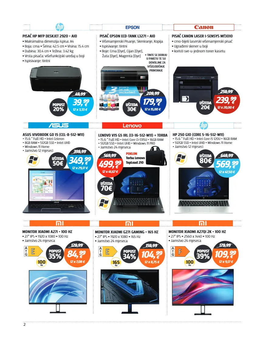 2 pisač hp mfp deskjet 2920 • aio • maksimalna dimenzija ispisa: a4 • • • boja: crna širina: 42.5 cm visina: 15.4 cm • • dubina: 30.4 cm težina: 3.42 kg • vrsta pisača: višefunkcijski uređaj u boji • ispisivanje: tintni pisač epson eco-tank l3271 • aio • višenamjenski pisanje, skeniranje, kopija • ispisivanje: tintni • boje: crna [dye], cijan [dye], žuta [dye], magenta [dye] pisač canon laser i-sensys mf3010 • crno-bijeli laserski višenamjenski pisač • ugrađeni skener u boji • koristi sve-u-jednom toner kasetu popust 20% 39,⁹⁹ € 49,99 12 x 3,33 € 179,⁹⁹ 239,⁹⁹ € € 209,99 259,99 12 x 15,00 € 12 x 20,00 € ušteda 30€ ušteda 20€ • tinte se dobiju u paketu te su dovoljne za višegodišnje printanje hp 250 g10 (core 5-16-512-w11) intel core i5 120u 16gb ram 15.6 " full hd • • • 512gb ssd intel uhd windows 11 home • • • jamstvo 12 i • mjesec lenovo v15 g5 irl (i3-16-512-w11) + torba intel core i3-1315u 16gb ram 15.6 " full hd • • • 512gb ssd intel uhd windows 11 pro • • • • jamstvo 24 mjeseca 649,99 569,99 569,⁹⁹ 499,⁹⁹ € € 12 x 47,50 € 12 x 41,67 € ušteda 80€ ušteda 70€ poklon torba lenovo topload 210 asus vivobook go 15 (cel-8-512-w11) intel celeron 15.6 " full hd • • 8gb ram 512gb ssd intel uhd • • • windows 11 home • • jamstvo 12 mjeseci 399,99 349,⁹⁹ € 12 x 29,17 € ušteda 50€ 129,99 159,99 84,⁹⁹ 104,⁹⁹ € € 12 x 7,08 € 12 x 8,75 € popust 35% popust 34% monitor xiaomi a27i • 100 hz • • • 27" ips 1920 x 1080 100 hz jamstvo 24 mjeseca • monitor xiaomi g27i gaming • 165 hz • • • 27" ips 1920 x 1080 165 hz jamstvo 24 mjeseca • monitor xiaomi a27qi 2k • 100 hz • • • 27" ips 2560 x 1440 100 hz jamstvo 24 mjeseca • 100 hz 165 hz 100 hz 179,99 109,⁹⁹ € 12 x 9,17 € popust 39%