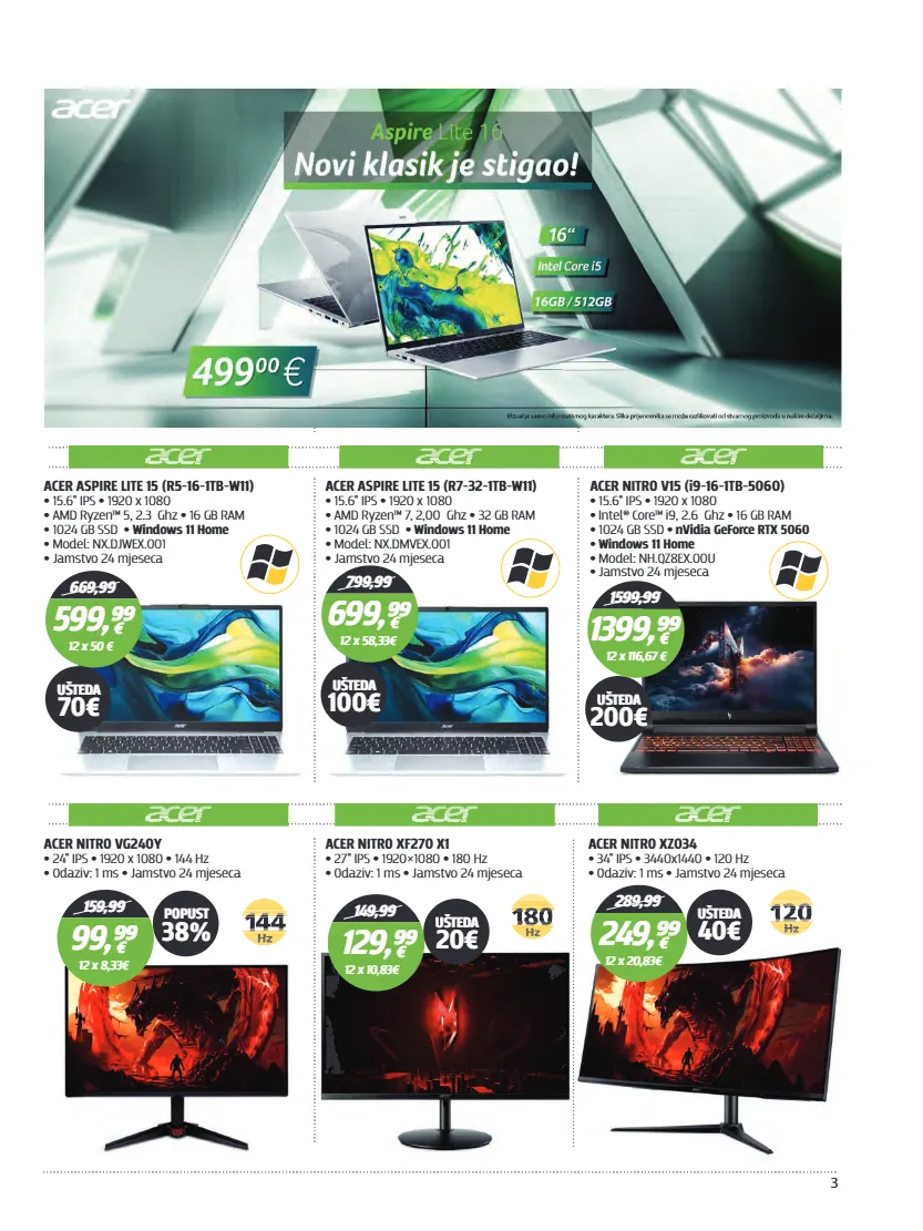 3 ACER ASPIRE LITE 15 (R5-16-1TB-W11) 15.6" IPS 1920 x 1080 • • AMD Ryzen™ 5, 2.3 Ghz 16 GB RAM • • 1024 GB SSD Windows 11 Home • • Model: NX.DJWEX.001 • Jamstvo 24 mjeseca • 669,99 599,⁹⁹ € 12 x 50 € UŠTEDA 70€ ACER ASPIRE LITE 15 (R7-32-1TB-W11) 15.6" IPS 1920 x 1080 • • AMD Ryzen™ 7, 2,00 Ghz 32 GB RAM • • 1024 GB SSD Windows 11 Home • • Model: NX.DMVEX.001 • Jamstvo 24 mjeseca • 799,99 699,⁹⁹ € 12 x 58,33€ UŠTEDA 100€ ACER NITRO V15 (i9-16-1TB-5060) 15.6" IPS 1920 x 1080 • • Intel® Core™ i9, 2.6 Ghz 16 GB RAM • • 1024 GB SSD nVidia GeForce RTX 5060 • • Windows 11 Home • Model: NH.QZ8EX.00U • Jamstvo 24 mjeseca • 1599,99 1399,⁹⁹ € 12 x 116,67 € UŠTEDA 200€ ACER NITRO VG240Y 24" IPS 1920 x 1080 144 Hz • • • Odaziv: 1 ms Jamstvo 24 mjeseca • • 159,99 99,⁹⁹ € 12 x 8,33€ ACER NITRO XF270 X1 27" IPS 1920×1080 180 Hz • • • Odaziv: 1 ms Jamstvo 24 mjeseca • • 149,99 129,⁹⁹ € 12 x 10,83€ POPUST 38% UŠTEDA 20€ ACER NITRO XZ034 34" IPS 3440x1440 120 Hz • • • Odaziv: 1 ms Jamstvo 24 mjeseca • • 289,99 249,⁹⁹ € 12 x 20,83€ UŠTEDA 40€
